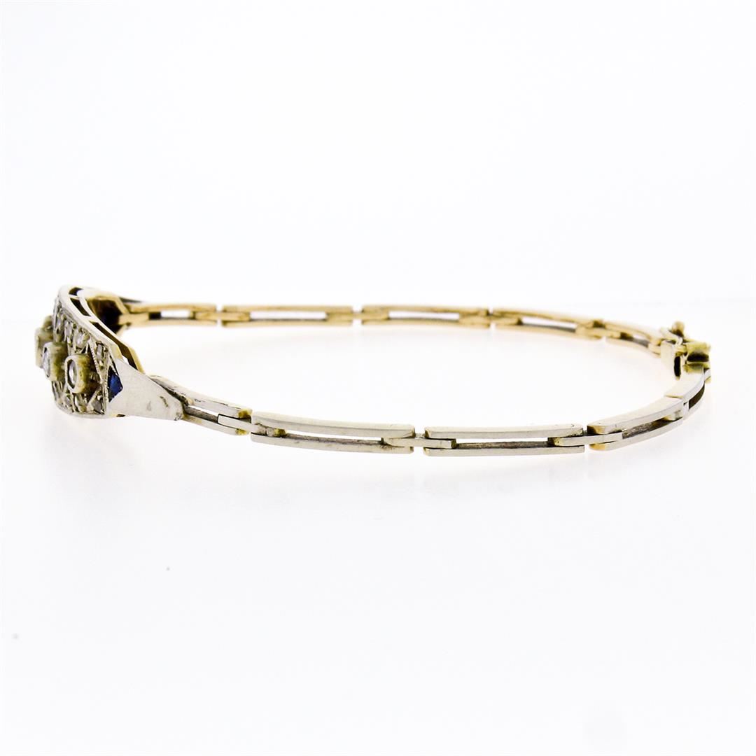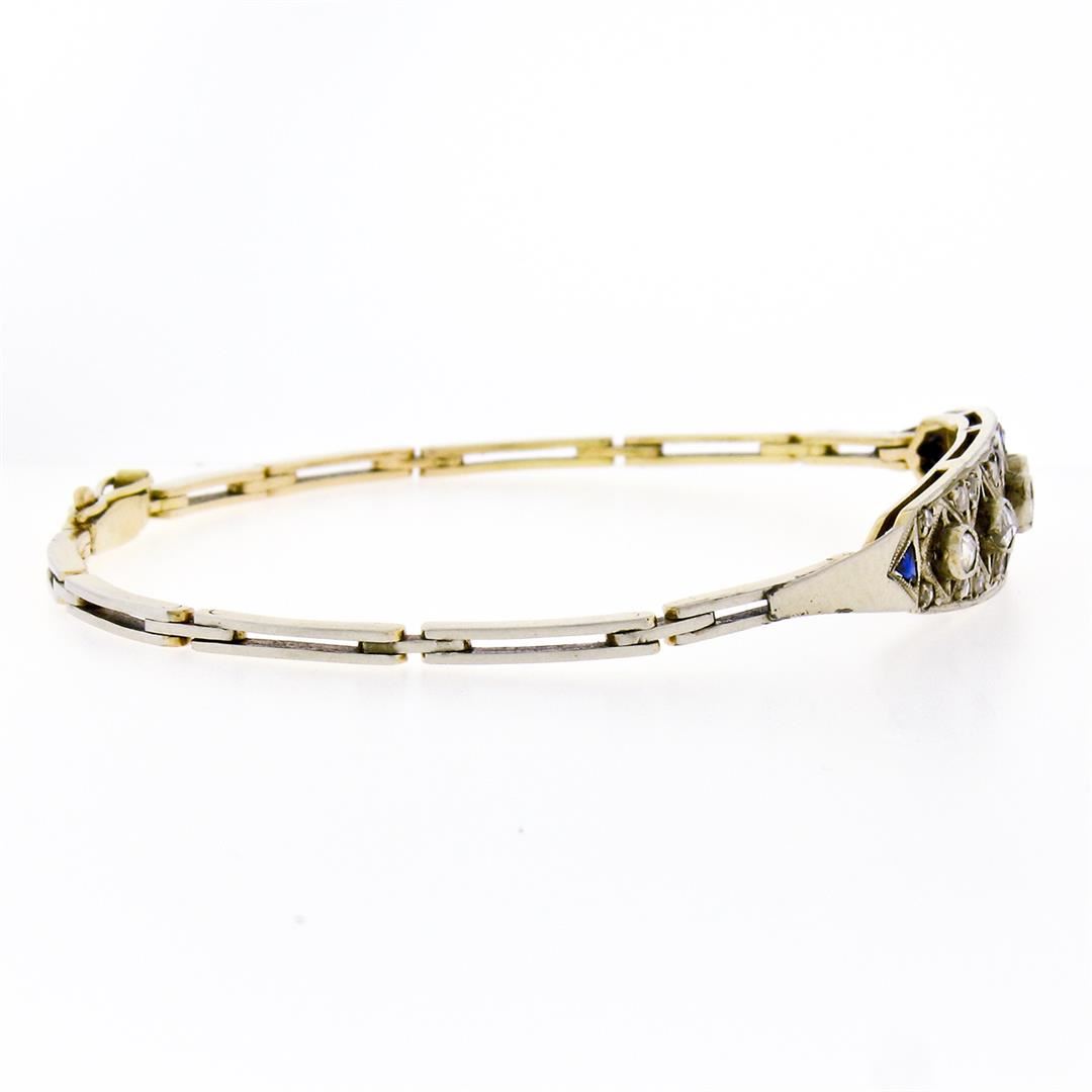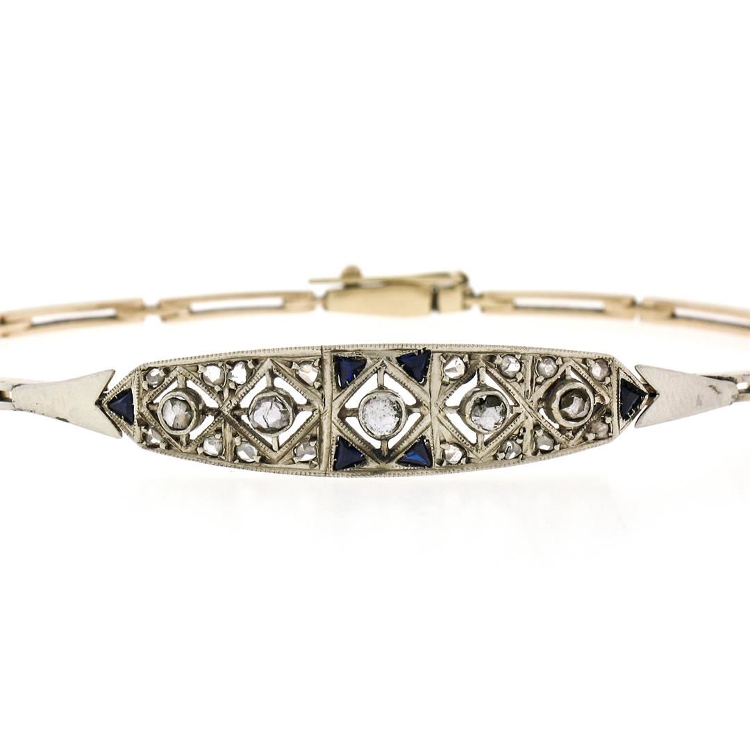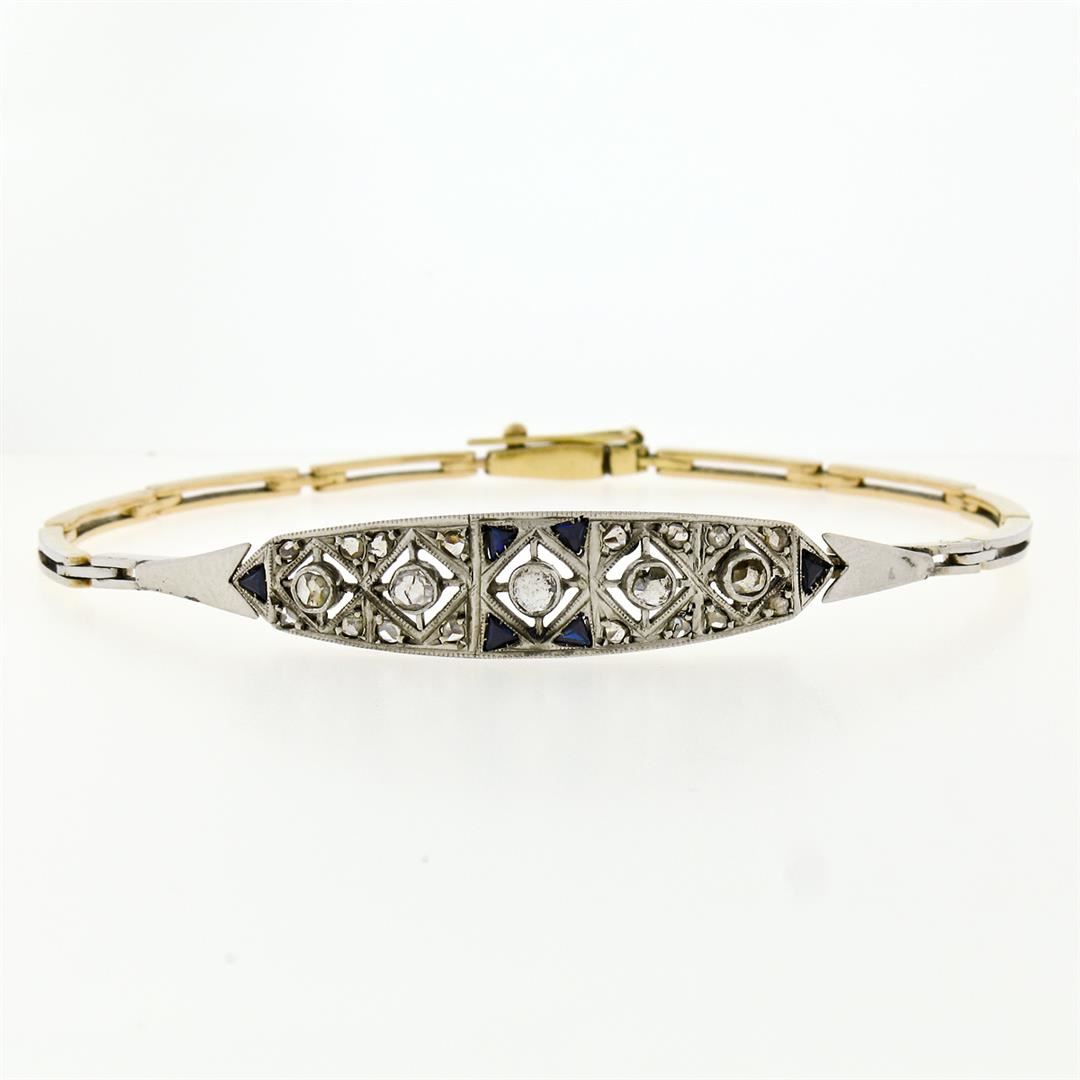 Antique Edwardian Handmade 18K Gold .80ct Rose Cut Diamond Unique Belly Bracelet. Please see photos and description for all available information. An antique edwardian solid 18k yellow and white gold link bracelet, with 21 rose cut natural diamonds (0.80ctw), and 6 triangular french cut natural sapphires. It weighs a total of 10.18 grams, measures 9.10mm wide, and measures 7 inches in length.