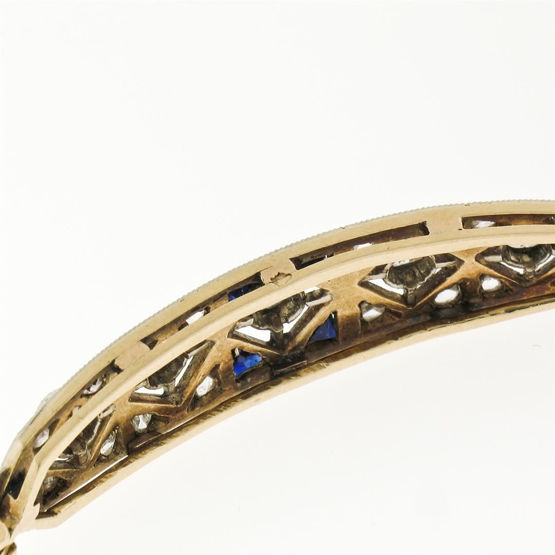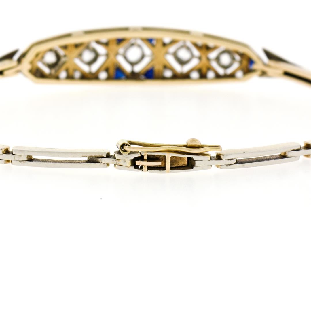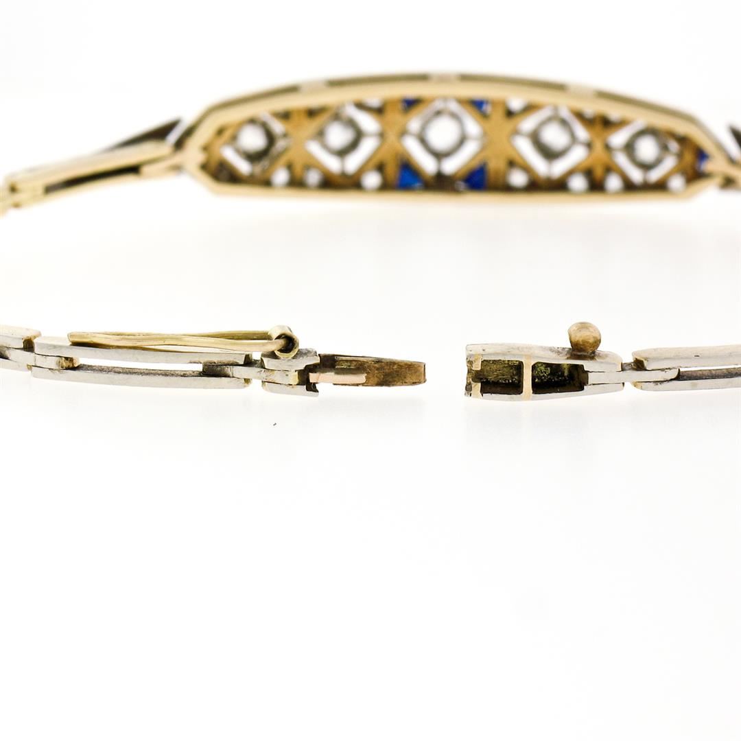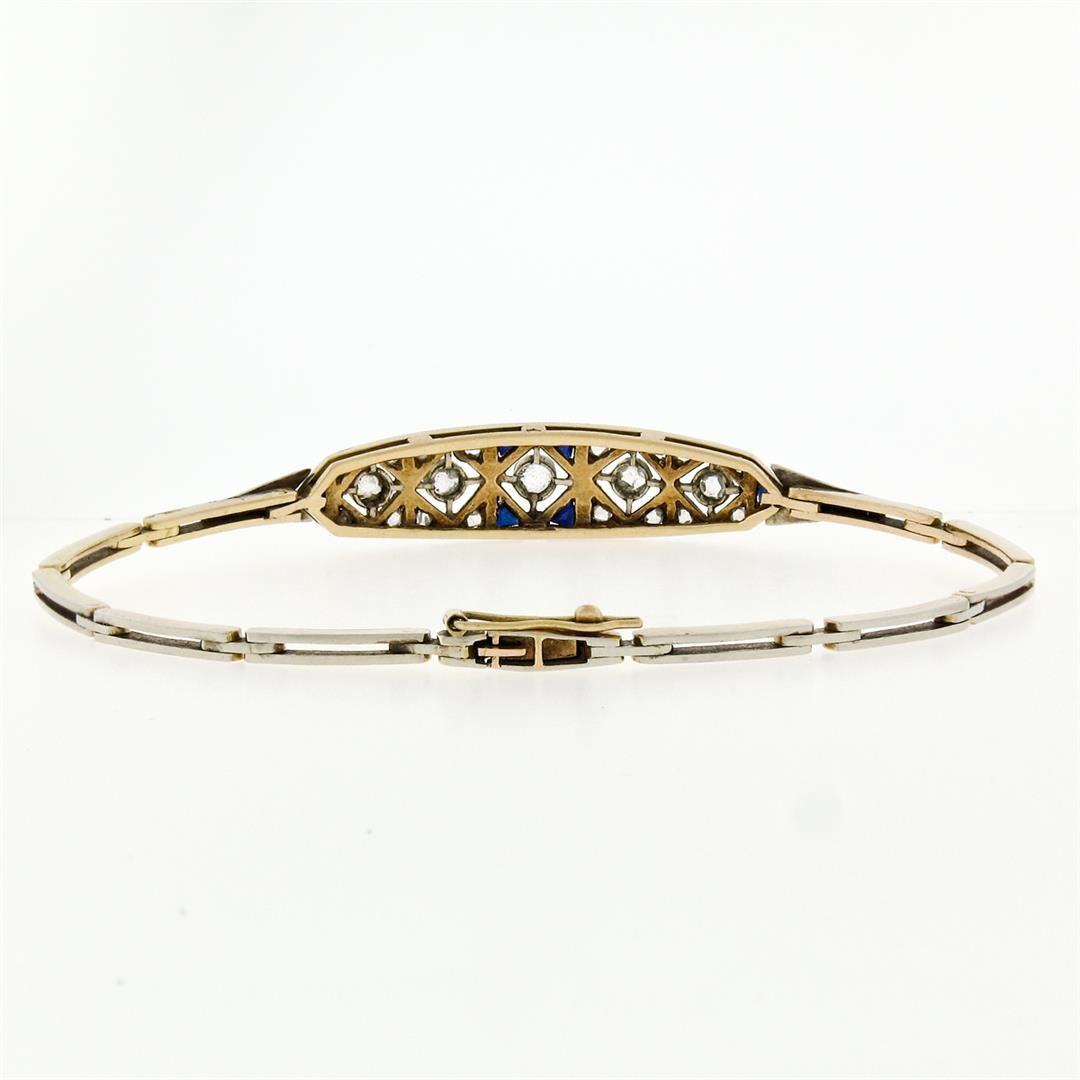 Antique Edwardian Handmade 18K Gold .80ct Rose Cut Diamond Unique Belly Bracelet. Please see photos and description for all available information. An antique edwardian solid 18k yellow and white gold link bracelet, with 21 rose cut natural diamonds (0.80ctw), and 6 triangular french cut natural sapphires. It weighs a total of 10.18 grams, measures 9.10mm wide, and measures 7 inches in length.