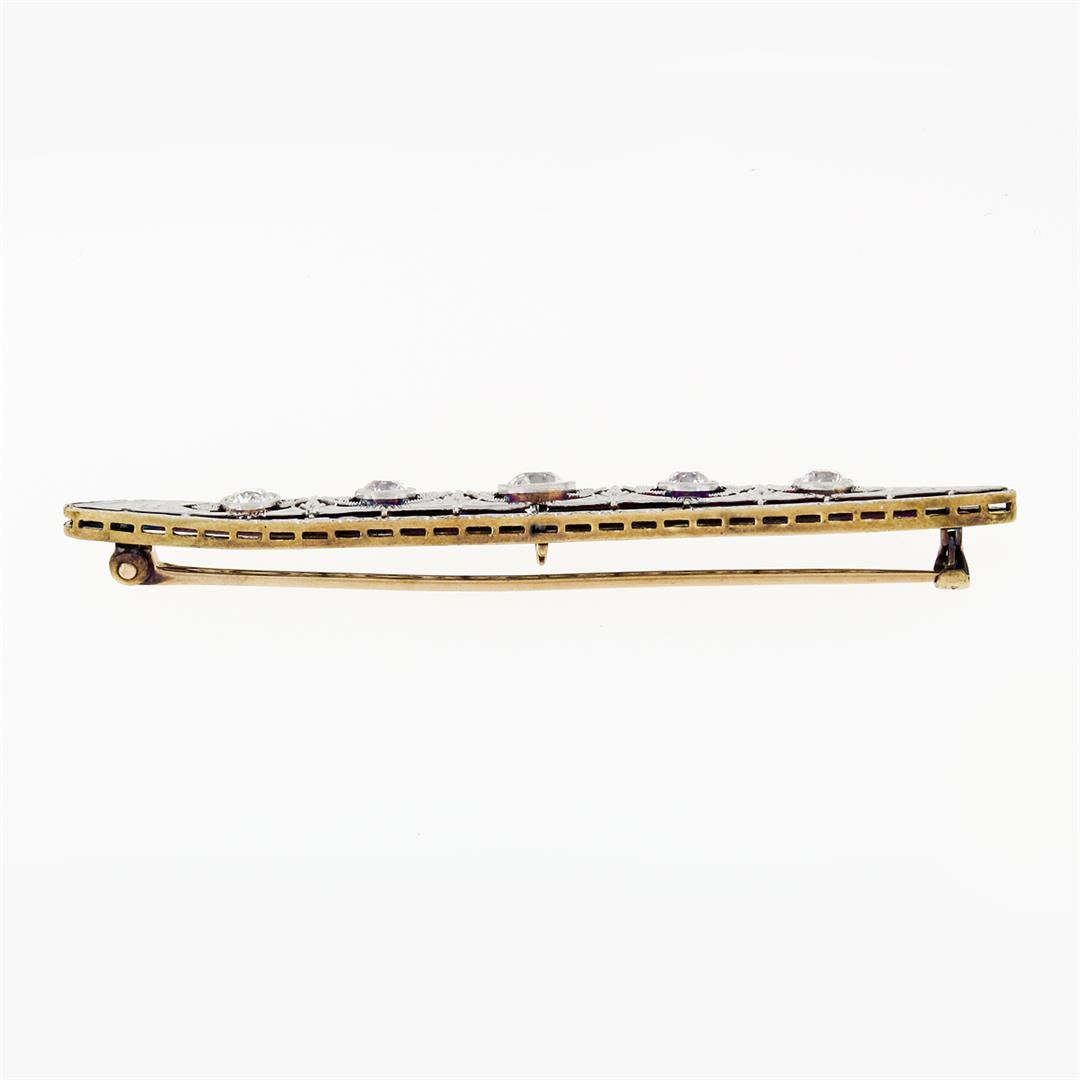 An antique erdwardian solid 14k yellow and whiye gold bar pin brooch, with 5 old european cut natural diamonds (G/H- VS1/VS2; 1.64ctw). Measures 70.6x7.5mm and weighs a total of 6.05 grams.