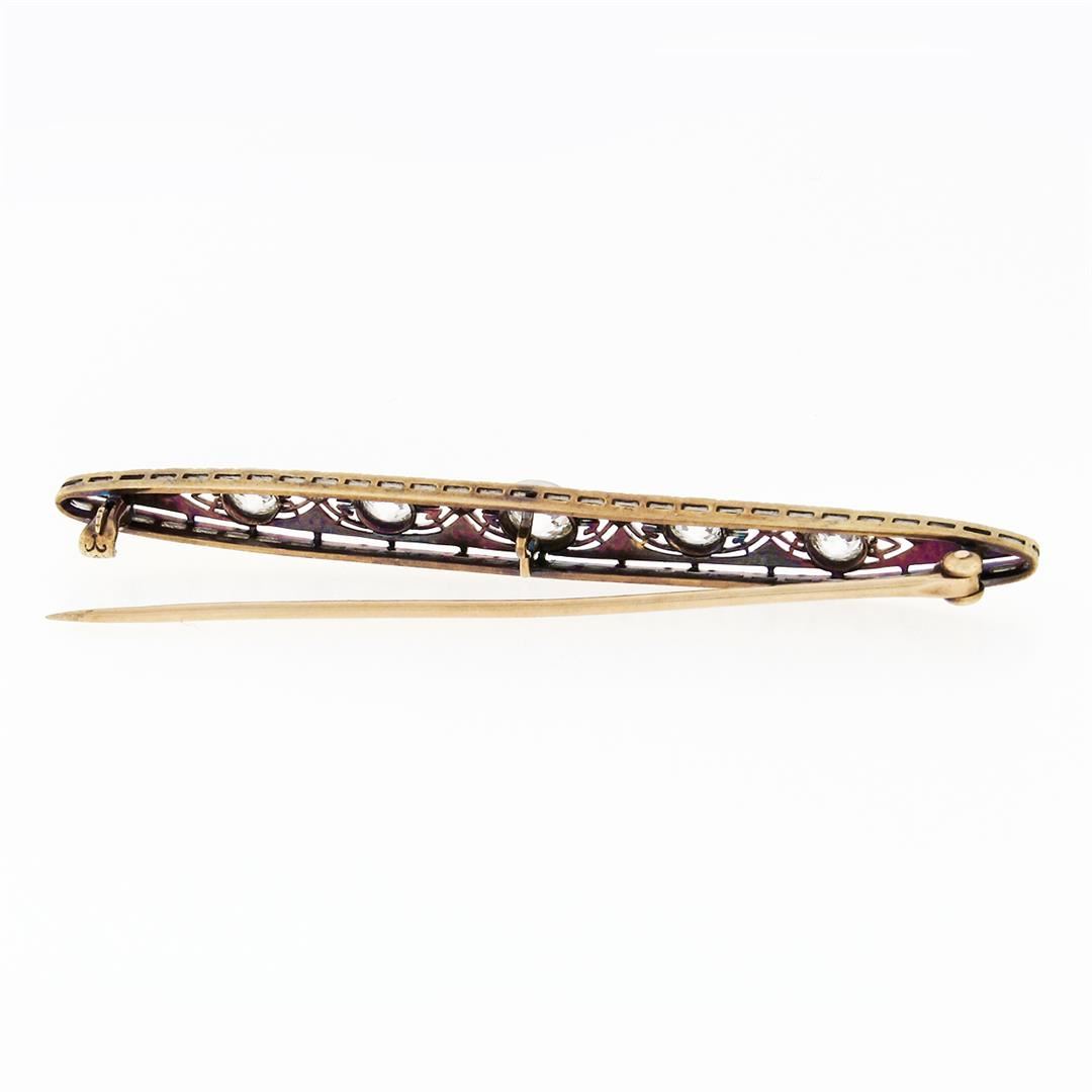 An antique erdwardian solid 14k yellow and whiye gold bar pin brooch, with 5 old european cut natural diamonds (G/H- VS1/VS2; 1.64ctw). Measures 70.6x7.5mm and weighs a total of 6.05 grams.