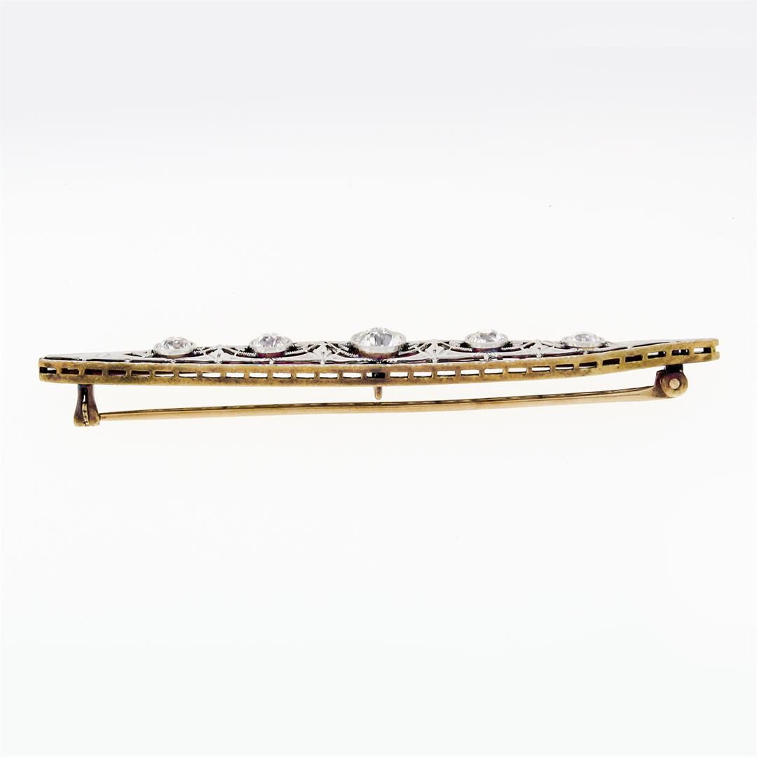 An antique erdwardian solid 14k yellow and whiye gold bar pin brooch, with 5 old european cut natural diamonds (G/H- VS1/VS2; 1.64ctw). Measures 70.6x7.5mm and weighs a total of 6.05 grams.