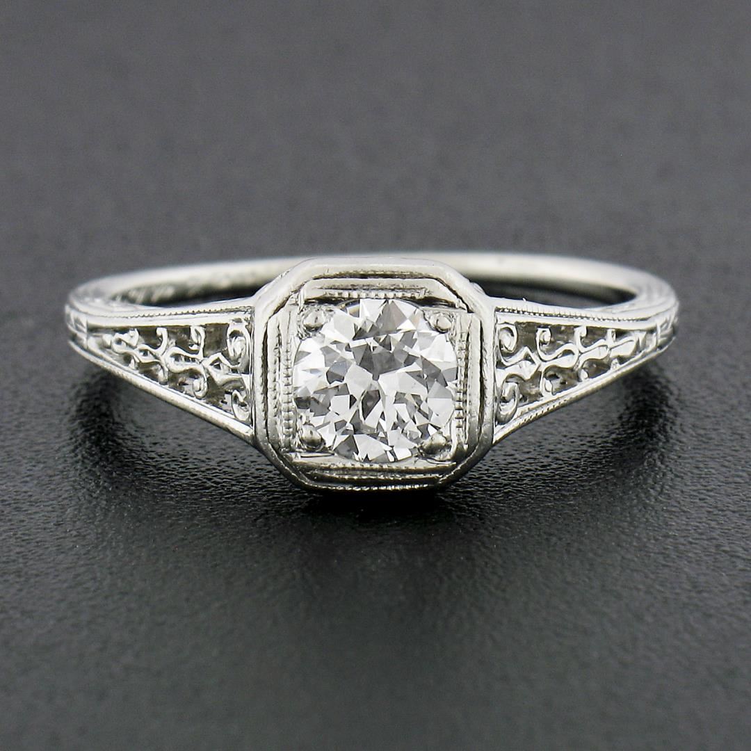 An antiuque solid platinum engagement ring, with 1 old european cut natural diamond (G - VS2 ; 0.47ct). The ring is size 6.0, weighs a total of 3.24 grams, and measures 7mm wide.