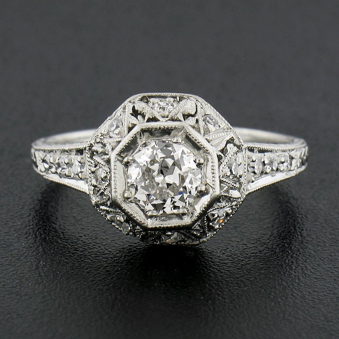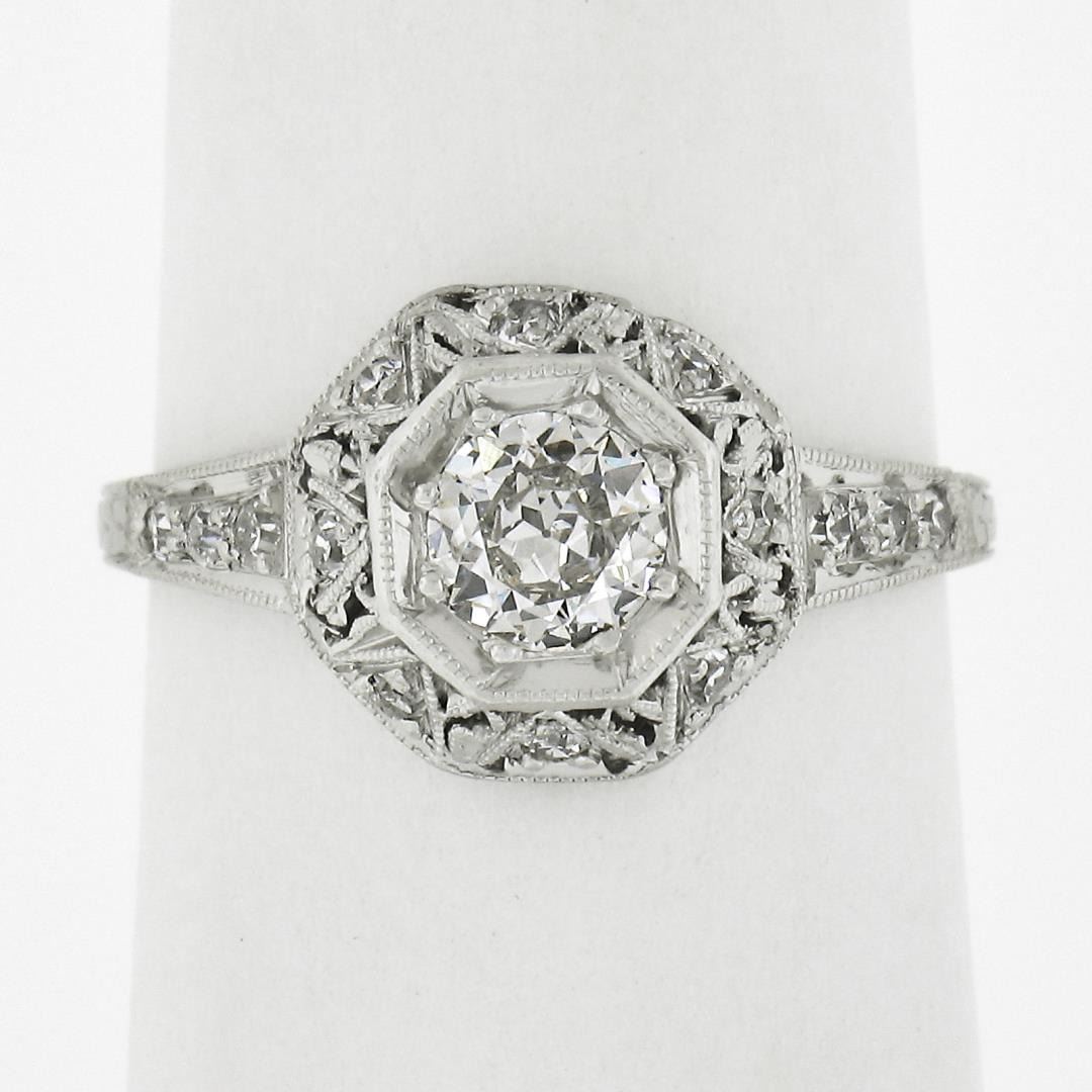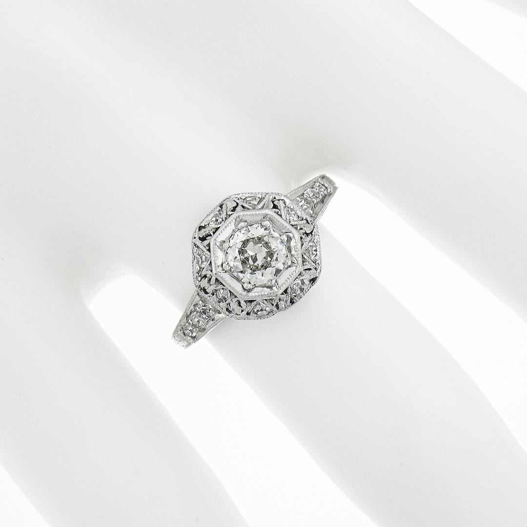An antique solid platinum engagement ring, with 1 old european cut natural diamond ( I - SI2 ; 0.46ct ), with 14 old european cut & old single cut natural diamonds (G-I - VS2-I1 ; 0.15ctw). The ring is size 6.0, weighs a total of 2.83 grams, and measures 10.1mm wide.