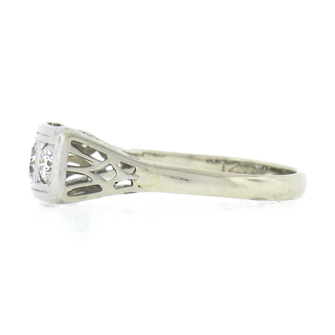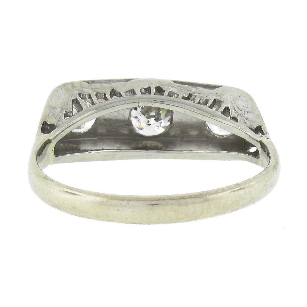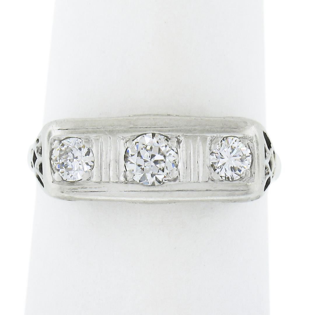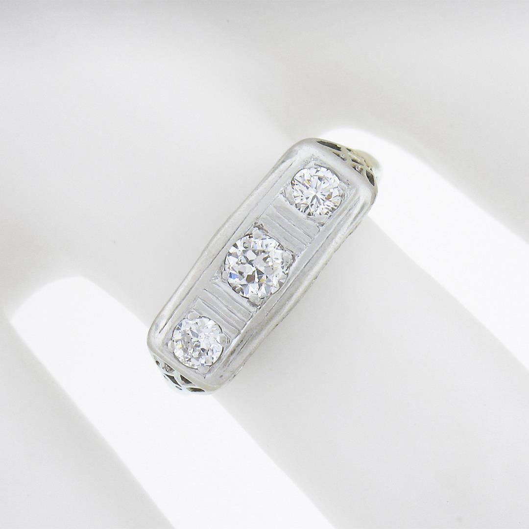 An antique solid platinum & 14k white gold band ring, with 3 old european cut natural diamonds (F/G - VS2-SI2 ; 0.35ctw). The ring is size 5.5, weighs a total of 2.50 grams, and measures 6.1mm wide.