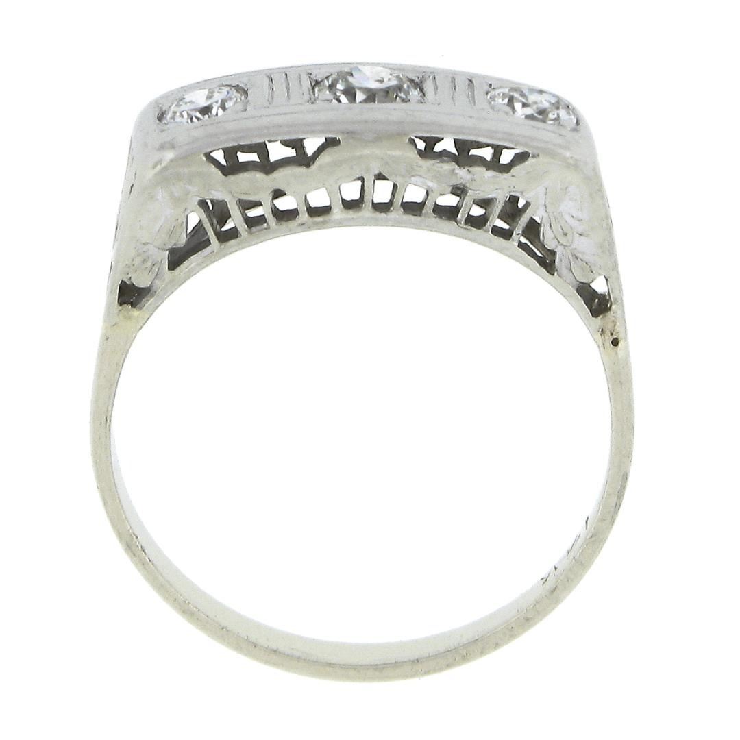 An antique solid platinum & 14k white gold band ring, with 3 old european cut natural diamonds (F/G - VS2-SI2 ; 0.35ctw). The ring is size 5.5, weighs a total of 2.50 grams, and measures 6.1mm wide.