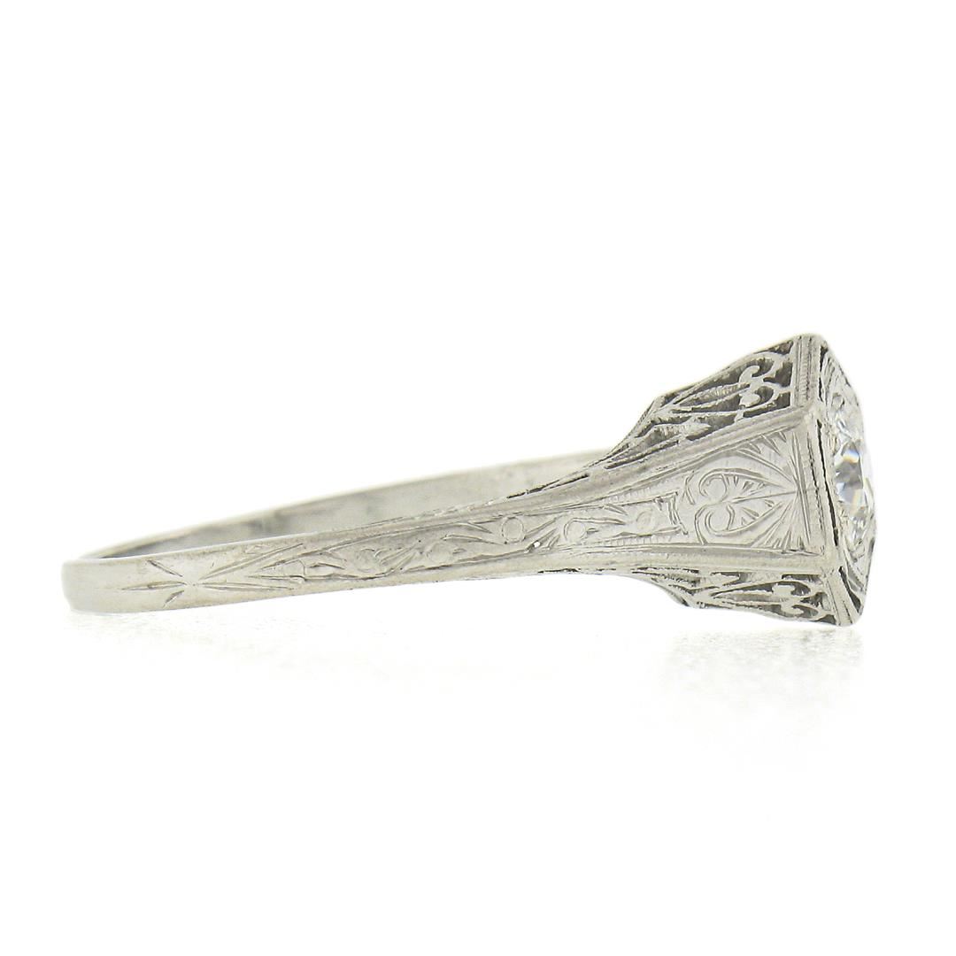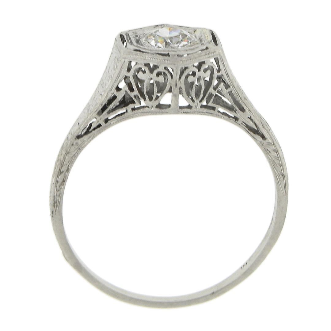 an Antique solid platinum engagement ring, with 1 old European cut natural diamond (G - VS1 ; 0.28ct). The ring is size 6.5, weighs a total of 2.52 grams, and measures 8.4mm wide.