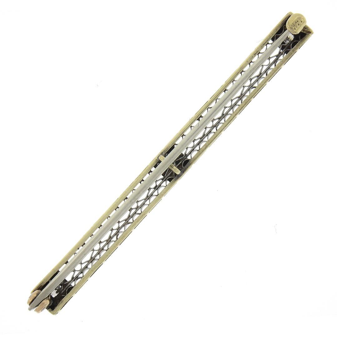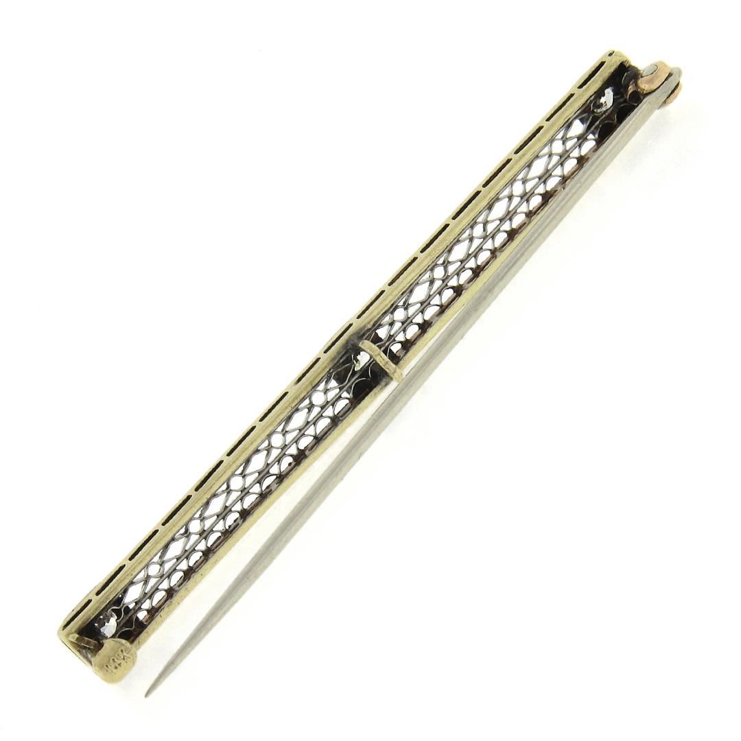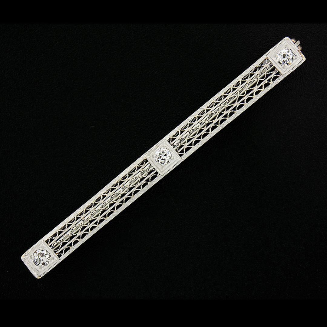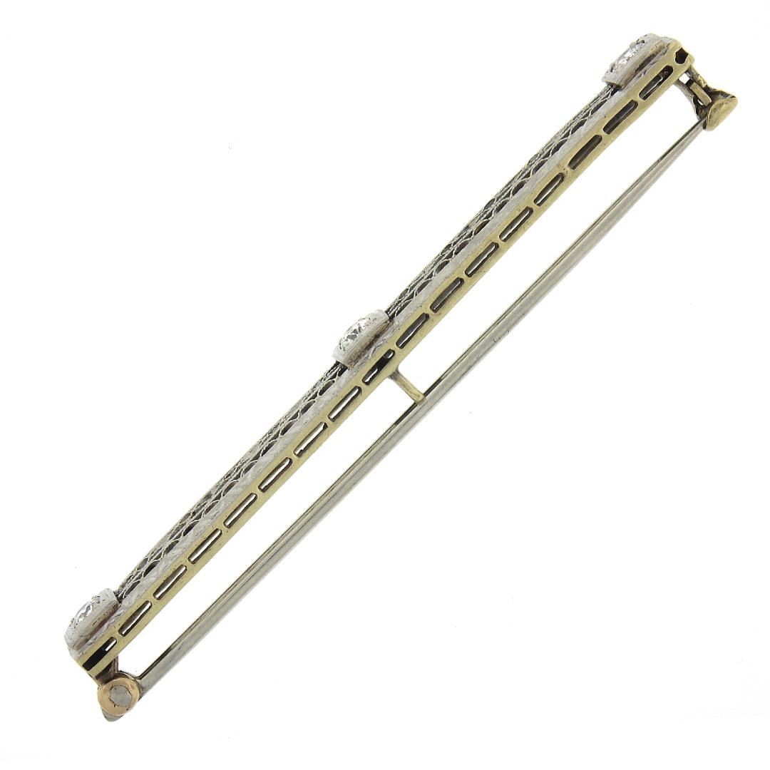 An antique solid platinum bar brooch, with 3 old european cut natural diamonds (H/I - VS1/VS2 ; 0.20ctw). Measures 5x56mm and weighs a total of 4.28 grams.