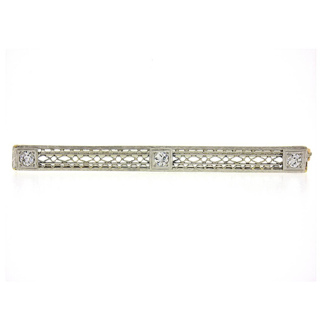 An antique solid platinum bar brooch, with 3 old european cut natural diamonds (H/I - VS1/VS2 ; 0.20ctw). Measures 5x56mm and weighs a total of 4.28 grams.