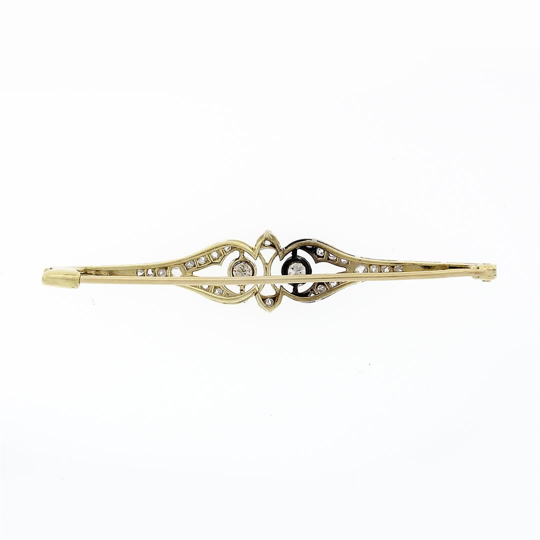 An antique edwardian solid platinum & 18k yellow gold bar pin brooch, with 28 old rose & european cut natural diamonds (G/J - VS2/SI2 ; 0.55ctw). Measures 10.65x56.9mm and weighs a total of 4.27 grams.
