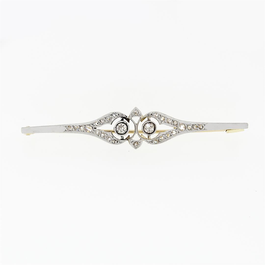 An antique edwardian solid platinum & 18k yellow gold bar pin brooch, with 28 old rose & european cut natural diamonds (G/J - VS2/SI2 ; 0.55ctw). Measures 10.65x56.9mm and weighs a total of 4.27 grams.