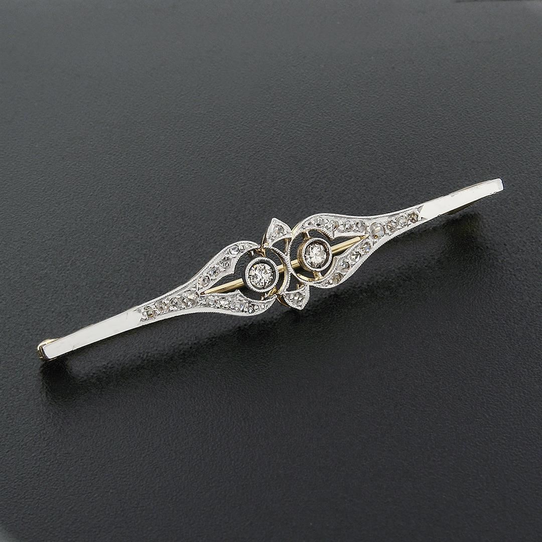 An antique edwardian solid platinum & 18k yellow gold bar pin brooch, with 28 old rose & european cut natural diamonds (G/J - VS2/SI2 ; 0.55ctw). Measures 10.65x56.9mm and weighs a total of 4.27 grams.