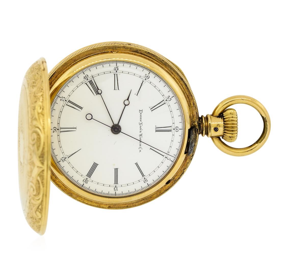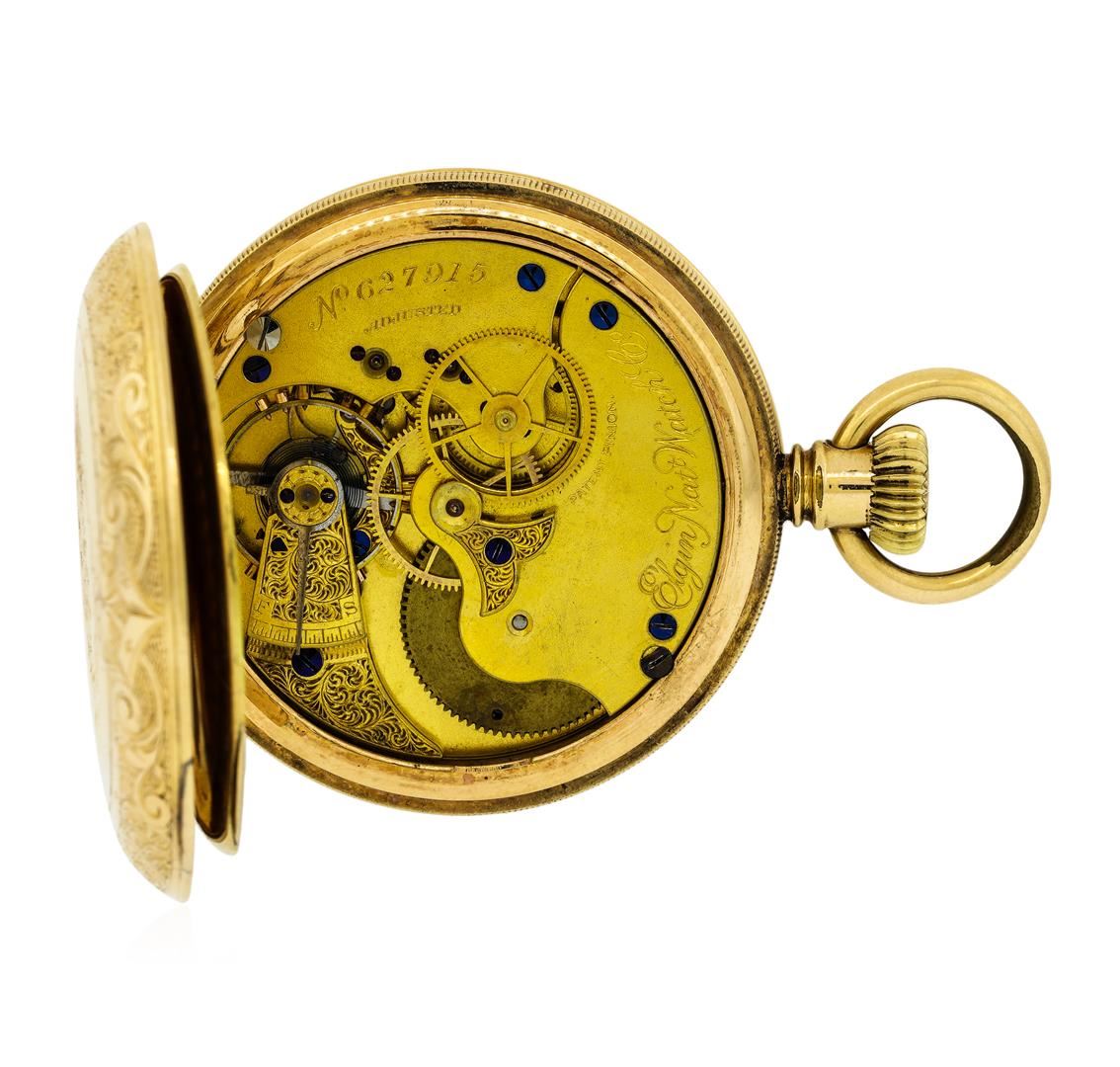 One antique Elgin full hunter case, pocketwatch electronically tested 14KT Yellow Gold filled, the case is stamped with a gold filled hallmark, Case Measurements: 50mm diameter, Dial Case Cover: ornate pattern with a raised central section available for engraving, Inner Movement Case Cover: polished, Outer Movement Case Cover: completed with an elaborate raised pattern, Bezel: polished, Crystal: acrylic. Circa: 1880. Movement: Elgin USA mechanical stem wind, Elgin Signed Dial: White, pointed hands, Roman numerals, minute indices and five minute markers, Condition: G-4 Average. Total Weight of Watch: 113.46gm.
