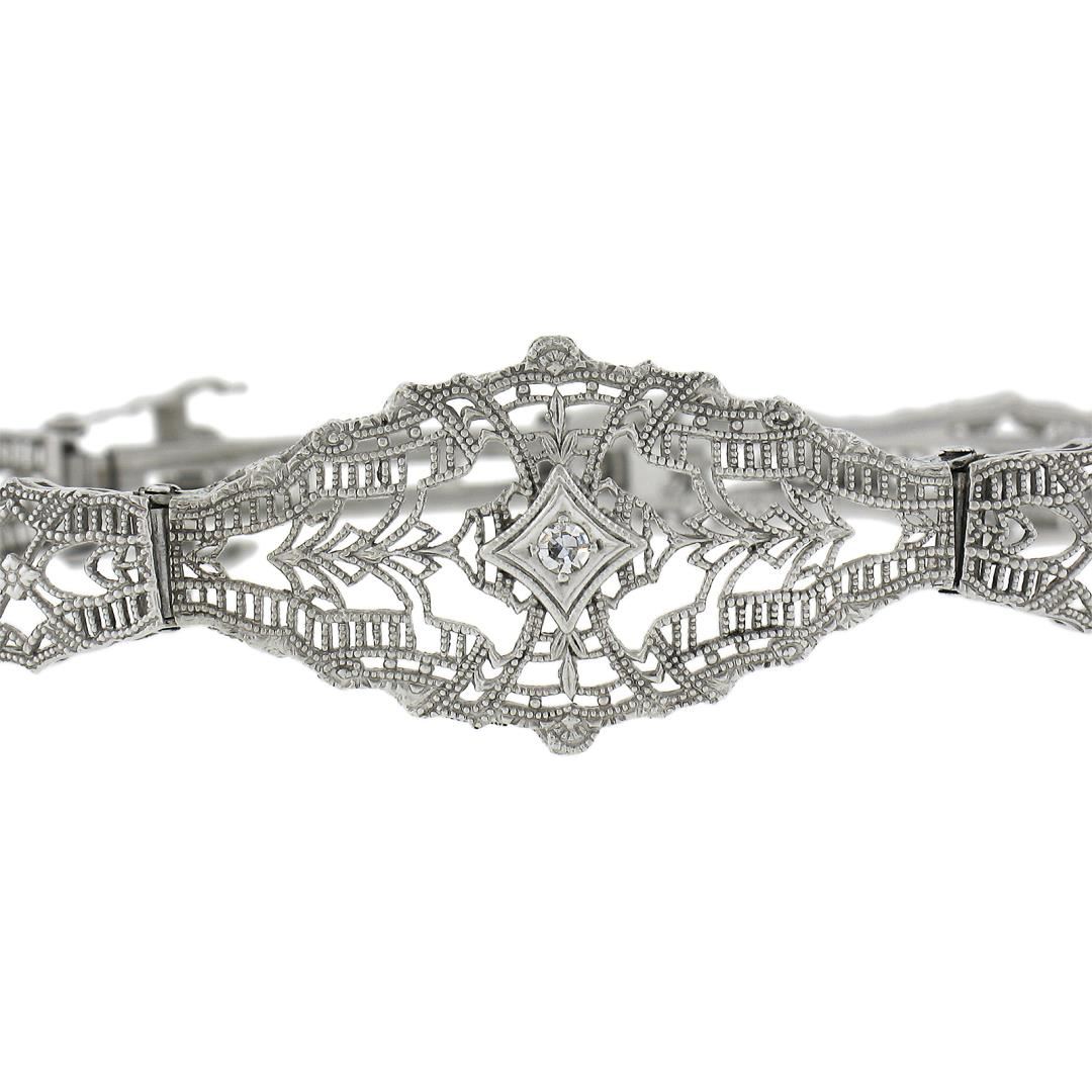 Antique Esemco 10k White Gold 0.03ct Diamond Milgrain Filigree Belly Bracelet
