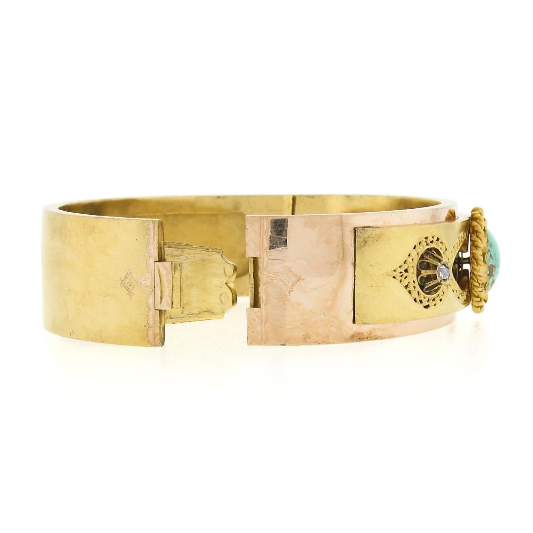 An antique solid 14k yellow gold bangle bracelet, with 1 round natural matrix turquoise (11.8mm), and 2 rose cut natural diamonds (0.10ctw). It weighs a total of 26.75 grams, measures 17.6mm wide, and measures 7 inches in length.