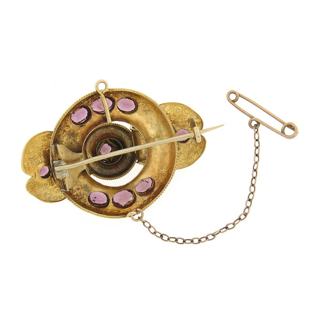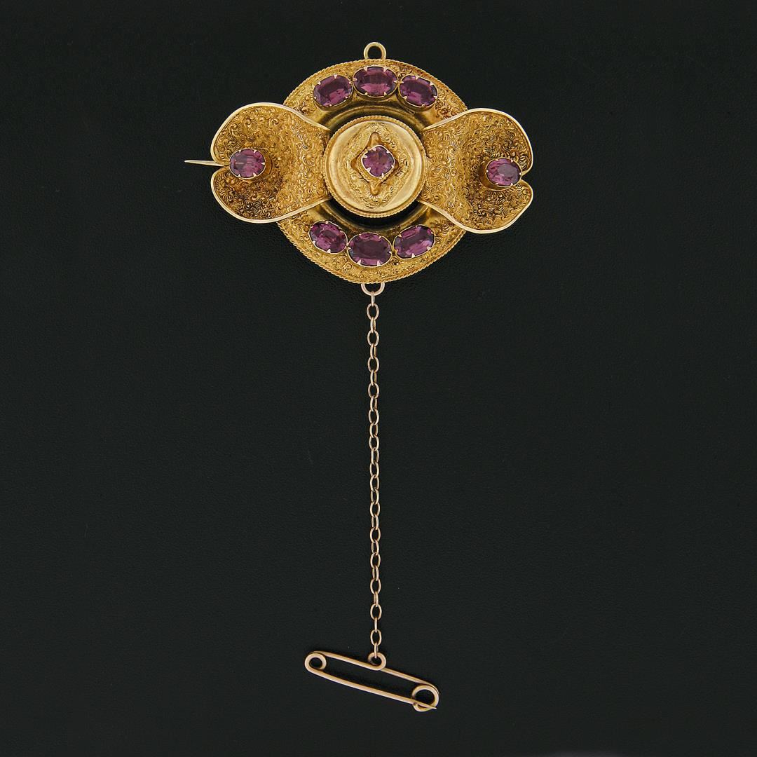 An antique solid 14k yellow gold brooch, with 9 round & oval cut natural rhodoliates garnets (1.80ctw). Measures 31x44.7mm and weighs a total of 7.06 grams.