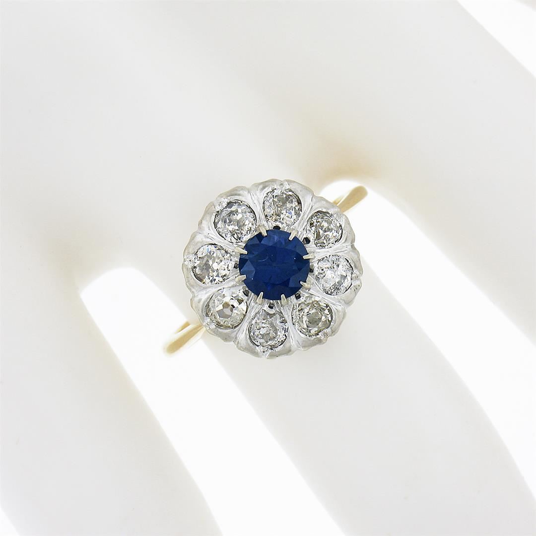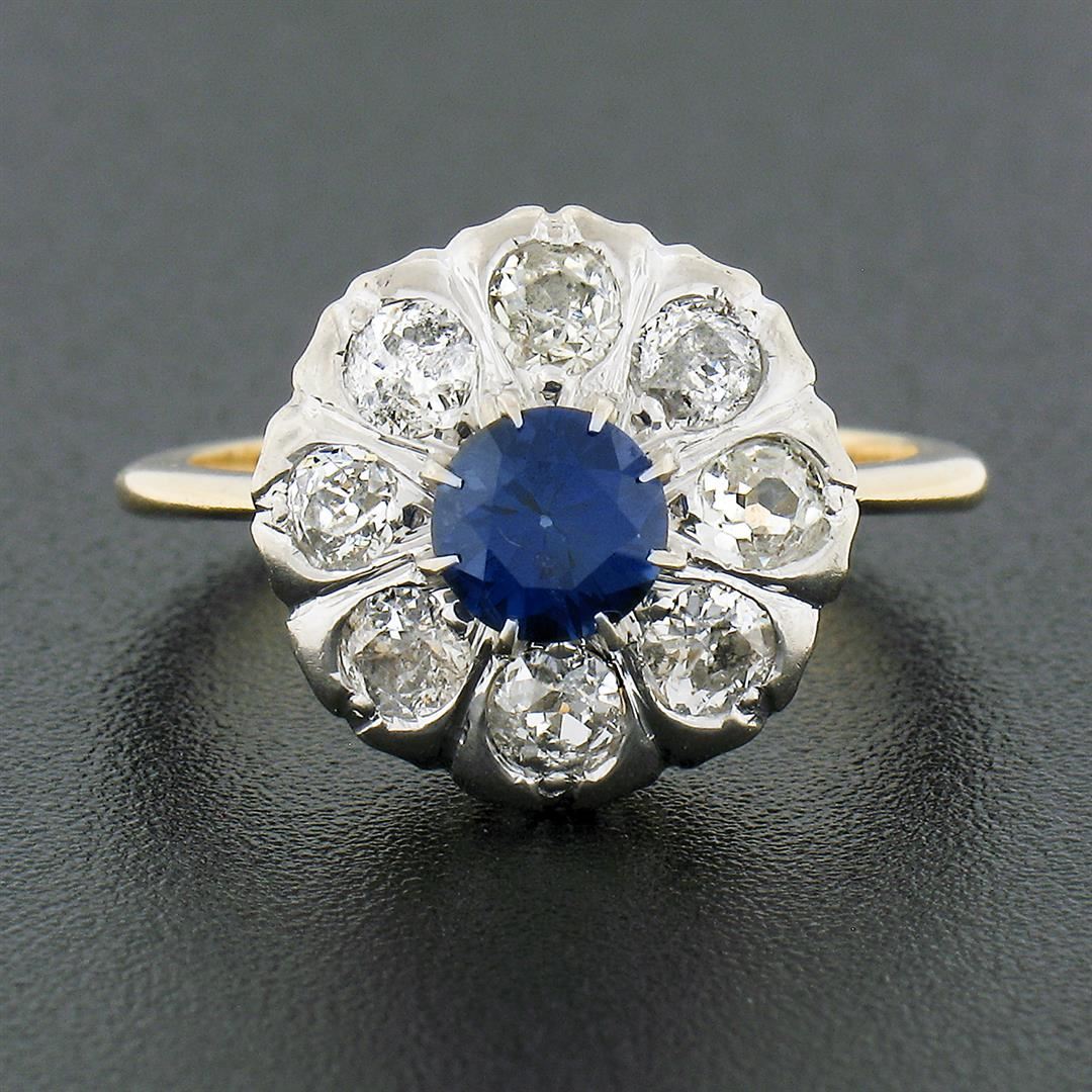 An antique solid 18k yellow and white gold cluster ring, with 1 Gia certified round cut natural blue sapphire (0.75ct ), and 8 old mine cut natural diamonds (F/G - SI2/I2 ; 1.00ctw). The ring is size 6.0, weighs a total of 4.49 grams, and measures 13.40mm wide. Comes with all original relevant certifications.