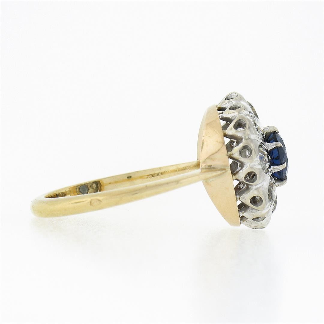 An antique solid 18k yellow and white gold cluster ring, with 1 Gia certified round cut natural blue sapphire (0.75ct ), and 8 old mine cut natural diamonds (F/G - SI2/I2 ; 1.00ctw). The ring is size 6.0, weighs a total of 4.49 grams, and measures 13.40mm wide. Comes with all original relevant certifications.
