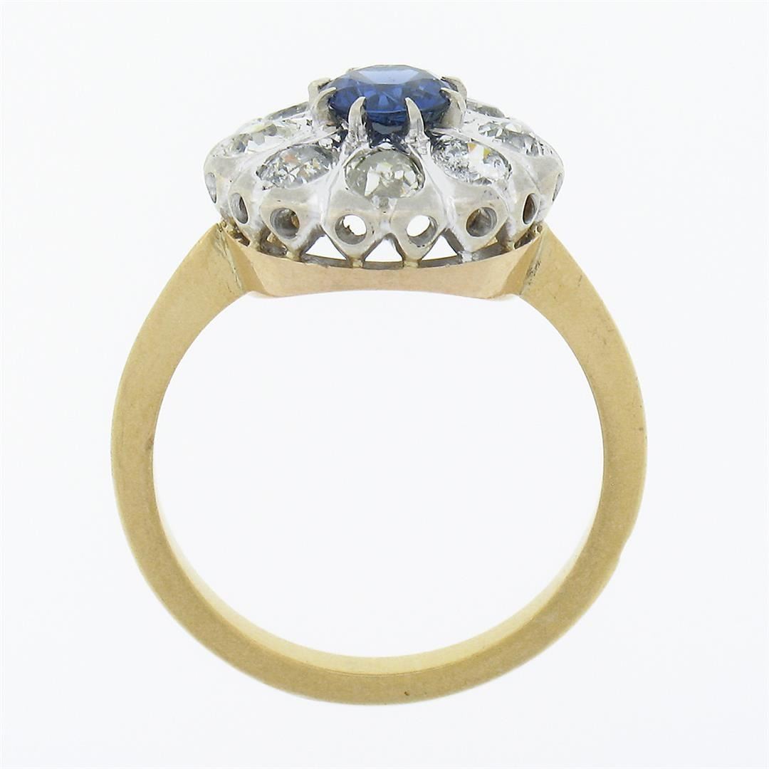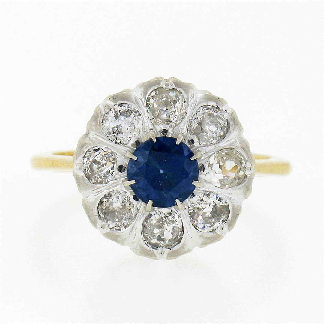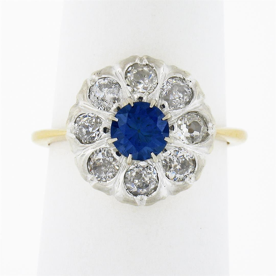 An antique solid 18k yellow and white gold cluster ring, with 1 Gia certified round cut natural blue sapphire (0.75ct ), and 8 old mine cut natural diamonds (F/G - SI2/I2 ; 1.00ctw). The ring is size 6.0, weighs a total of 4.49 grams, and measures 13.40mm wide. Comes with all original relevant certifications.