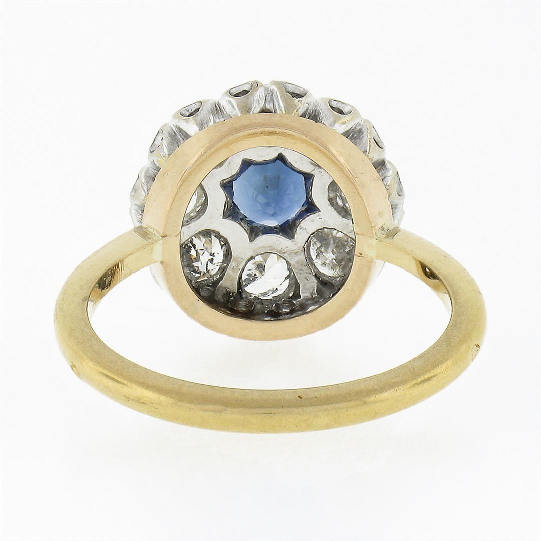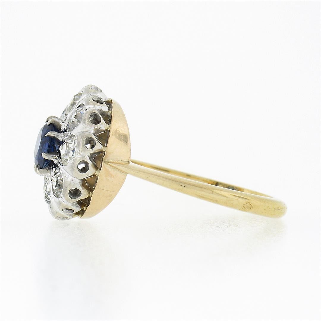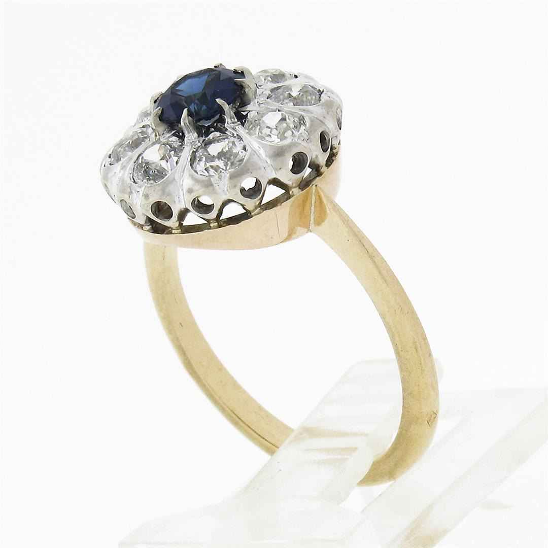 An antique solid 18k yellow and white gold cluster ring, with 1 Gia certified round cut natural blue sapphire (0.75ct ), and 8 old mine cut natural diamonds (F/G - SI2/I2 ; 1.00ctw). The ring is size 6.0, weighs a total of 4.49 grams, and measures 13.40mm wide. Comes with all original relevant certifications.