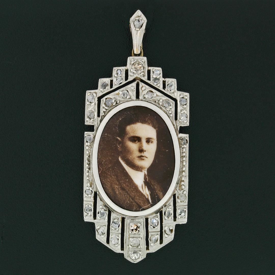 An antique solid 18k yellow gold and platinum portrait pendant with 33 rose cut natural diamonds (0.33ctw). The pendant weighs a total of 7.62 grams, measures 45.85x19mm including the bail, and the inside of the bail measures 2.4x4.4mm.