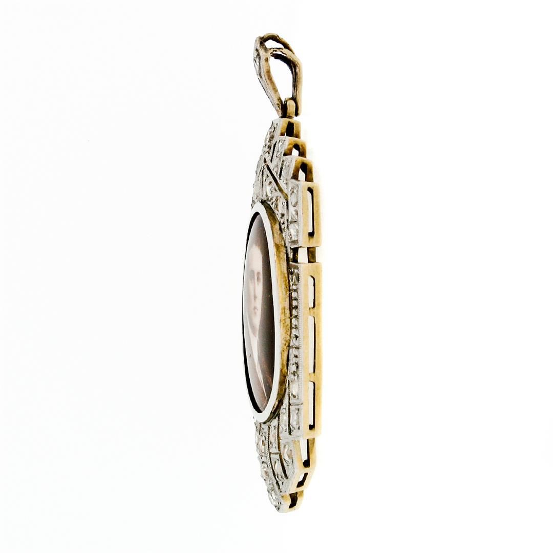 An antique solid 18k yellow gold and platinum portrait pendant with 33 rose cut natural diamonds (0.33ctw). The pendant weighs a total of 7.62 grams, measures 45.85x19mm including the bail, and the inside of the bail measures 2.4x4.4mm.
