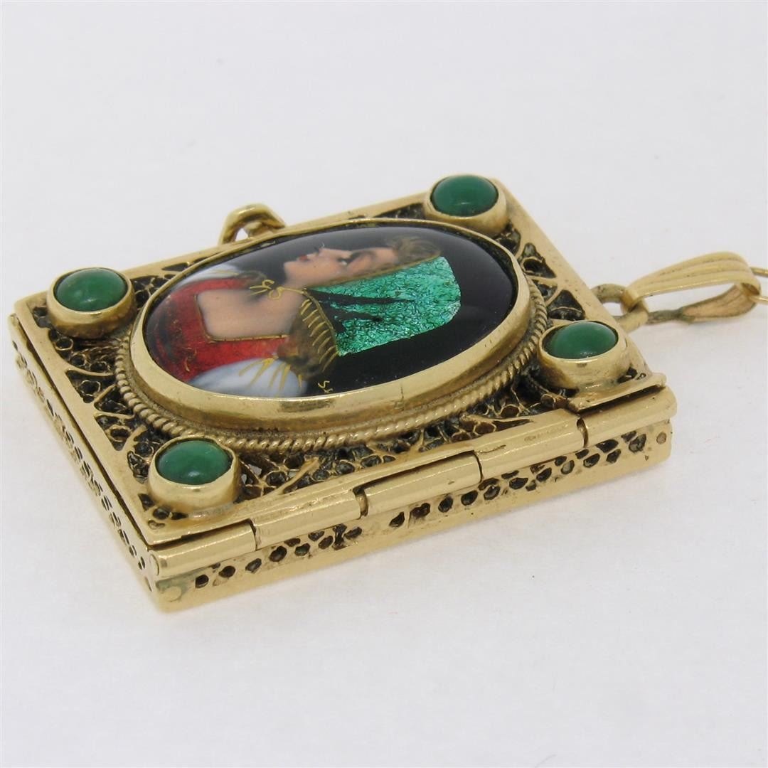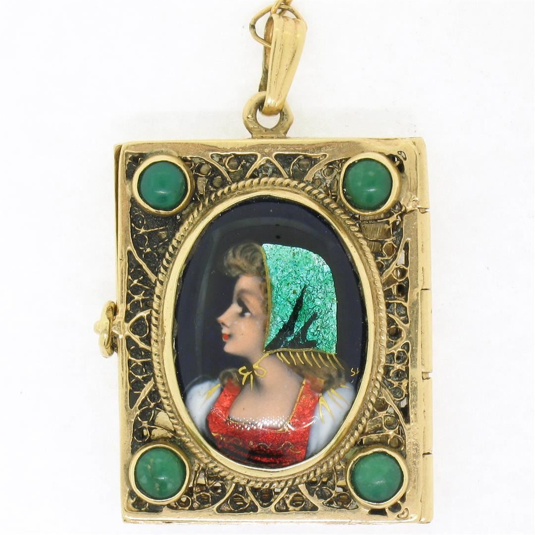 Antique French 14k Gold Turquoise Enamel Portrait Hinged Locket Pendant Necklace. Please see photos and description for all available information. An antique french solid 14k yellow gold locket pendant necklace, featuring 1 oval shape enamel portrait, sur