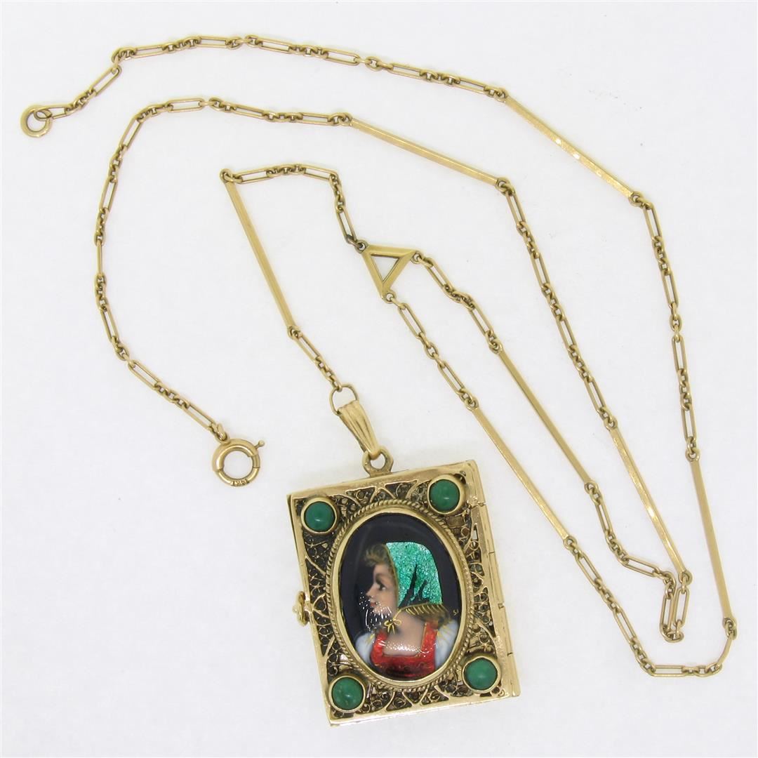 Antique French 14k Gold Turquoise Enamel Portrait Hinged Locket Pendant Necklace. Please see photos and description for all available information. An antique french solid 14k yellow gold locket pendant necklace, featuring 1 oval shape enamel portrait, surrounded with 4 round cabochon cut natural turquoise (3.55mm). The pendant weighs a total of 18.08 grams, measures 38.78x22.87mm including the bail, and 16.5 inch bar and cable link chain.