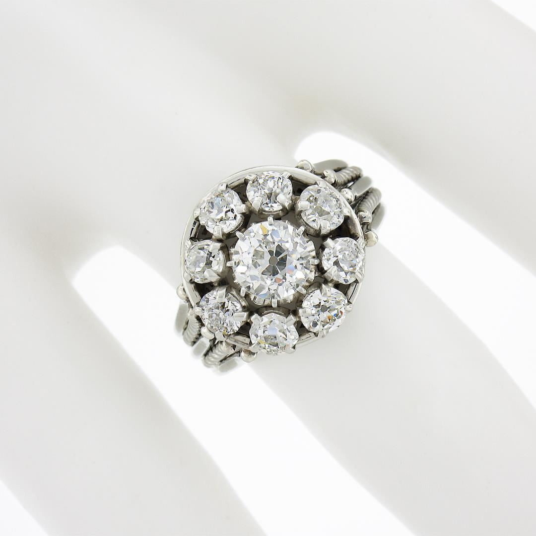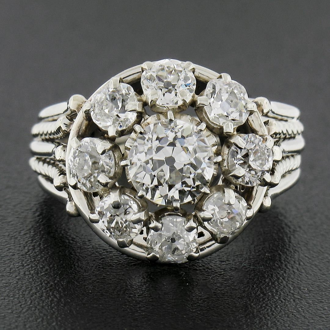 An antique french solid 18k white gold flower ring, with 1 GIA graded old european cut (J - VS1 ; 0.84ct ), surrouded with 8 old chunky european & old mine cut natural diamonds ( H/I - VS2/SI1 ; 1.28ctw). The ring is size 5.5, weighs a total of 6.93 grams, and measures 13.6mm wide. Comes with all original relevant certifications.