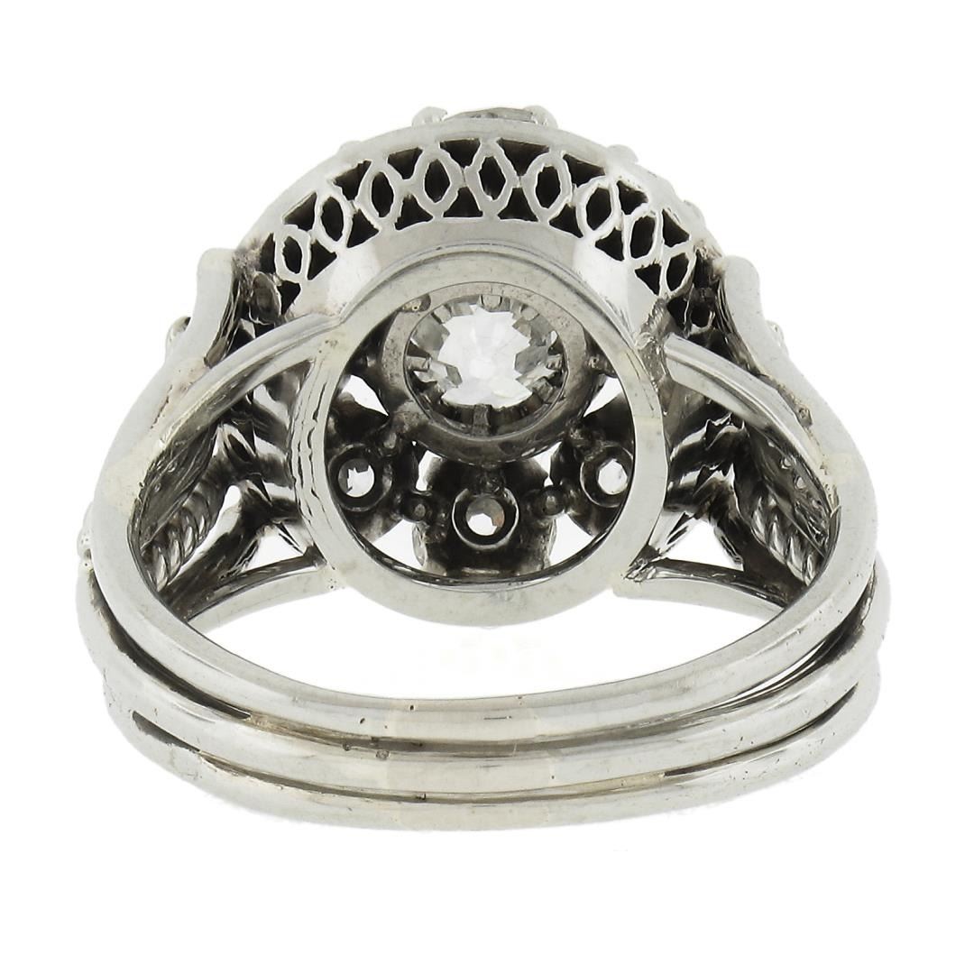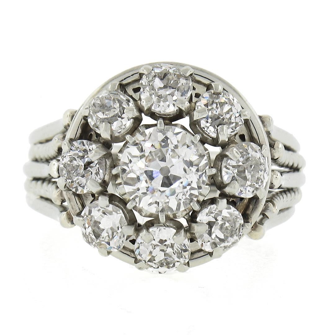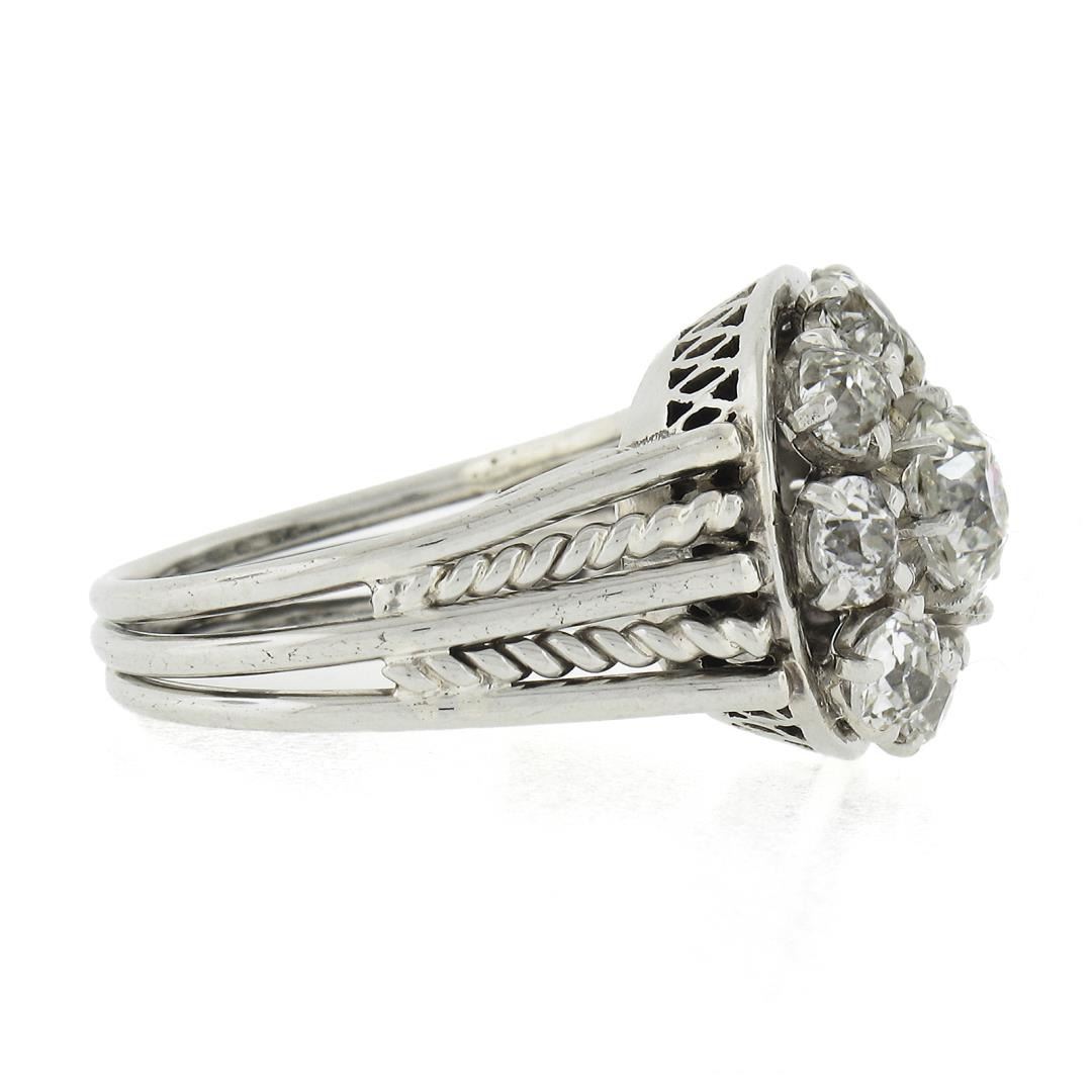 An antique french solid 18k white gold flower ring, with 1 GIA graded old european cut (J - VS1 ; 0.84ct ), surrouded with 8 old chunky european & old mine cut natural diamonds ( H/I - VS2/SI1 ; 1.28ctw). The ring is size 5.5, weighs a total of 6.93 grams, and measures 13.6mm wide. Comes with all original relevant certifications.