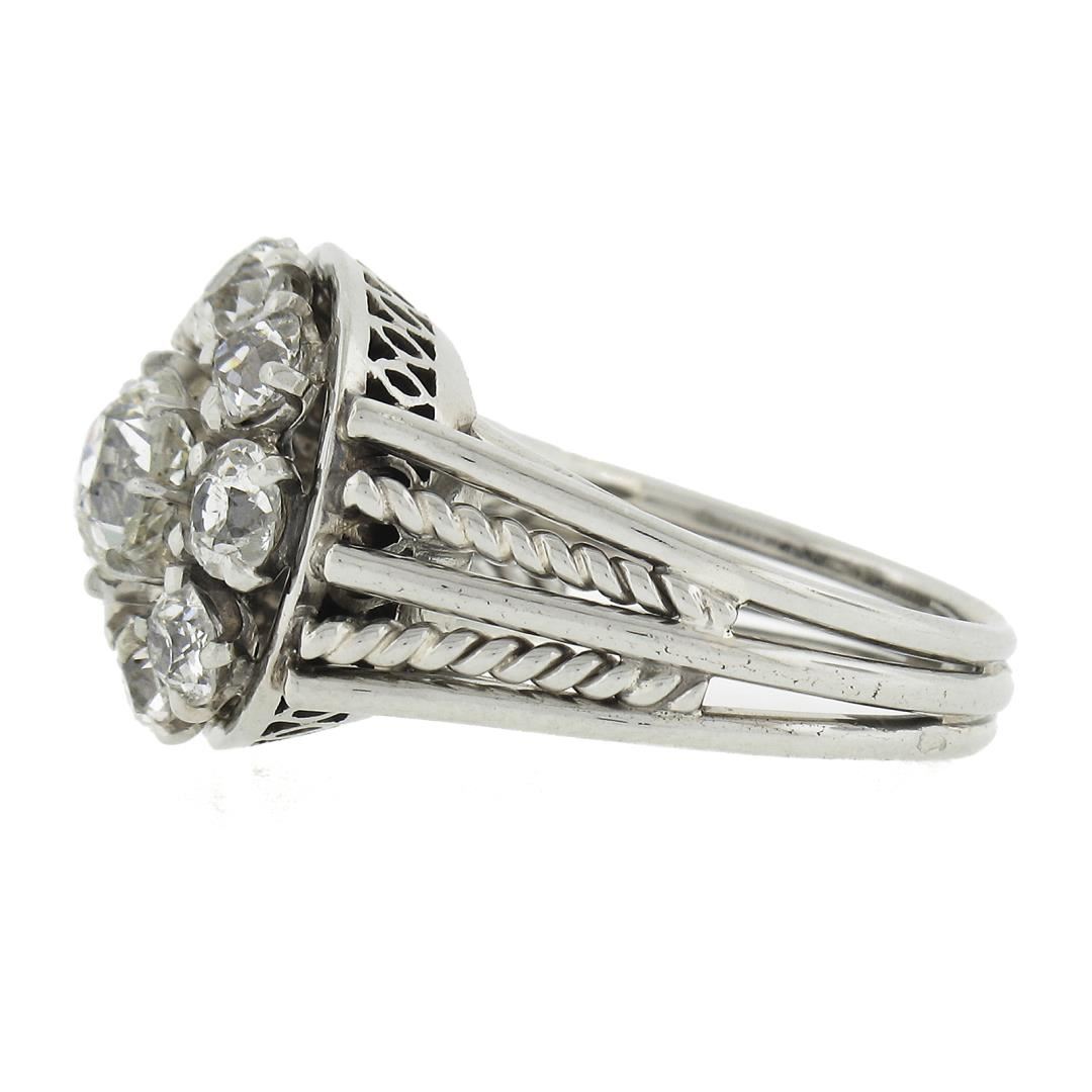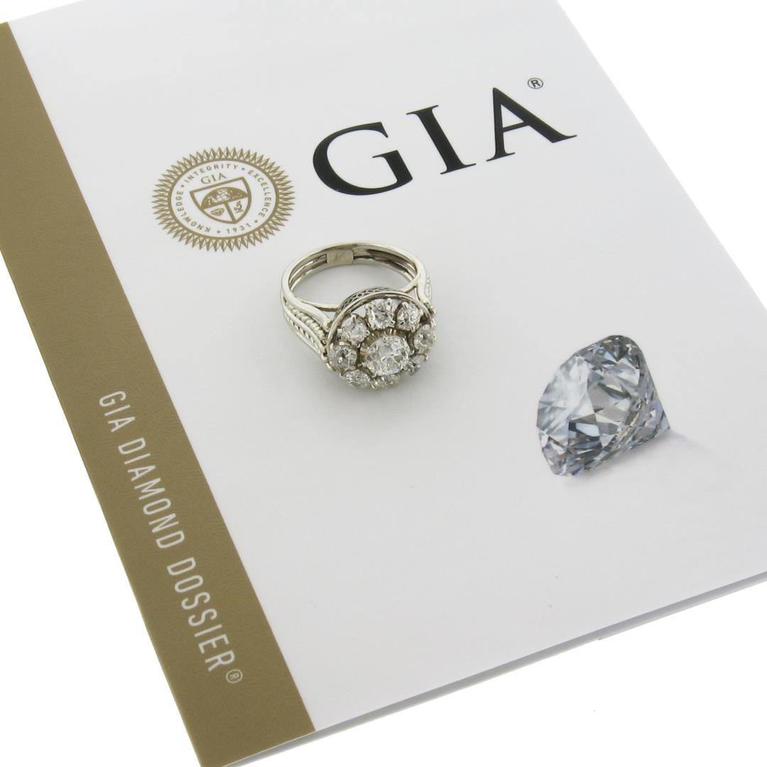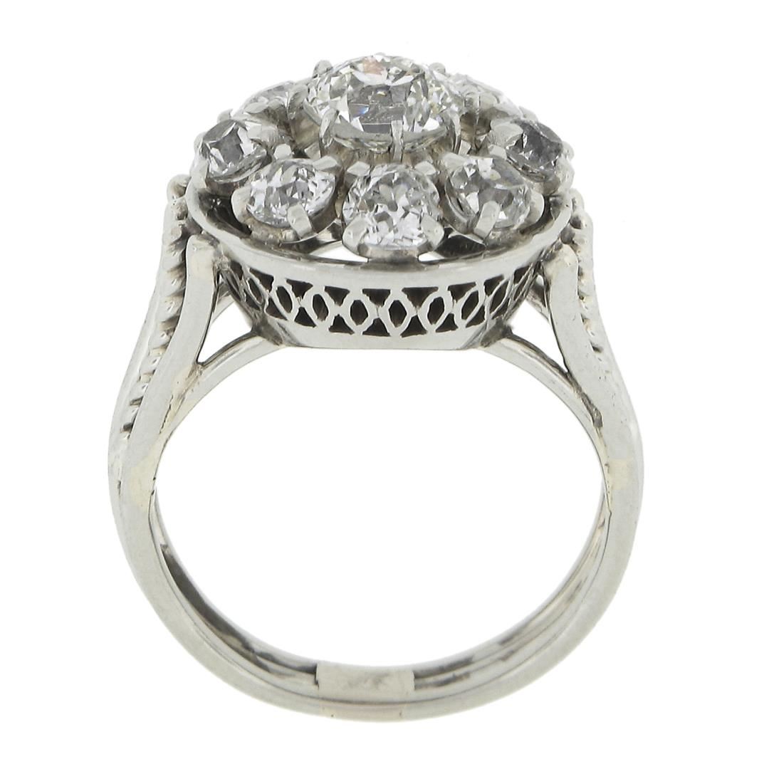 An antique french solid 18k white gold flower ring, with 1 GIA graded old european cut (J - VS1 ; 0.84ct ), surrouded with 8 old chunky european & old mine cut natural diamonds ( H/I - VS2/SI1 ; 1.28ctw). The ring is size 5.5, weighs a total of 6.93 grams, and measures 13.6mm wide. Comes with all original relevant certifications.