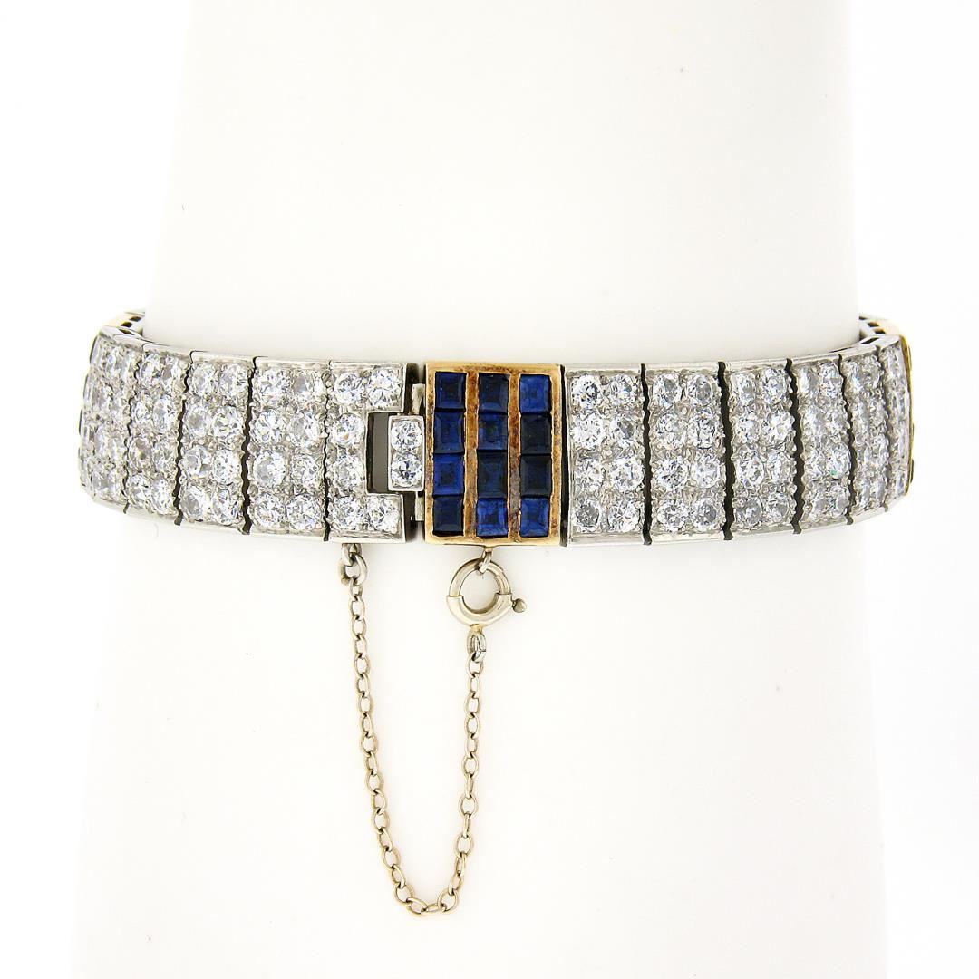 A french antique solid 18k yellow gold and .900 platinum wide bracelet. with 192 old european and old single cut natural diamonds (G/H - VS1/VS2 Clarity w/ A Few SI1 ; 12.85ctw), with 48 square step cut natural sapphires (5.0ctw). it weighs a total of 37.04 grams, measures 12.50mm wide, and measures 6.5 inches in length.