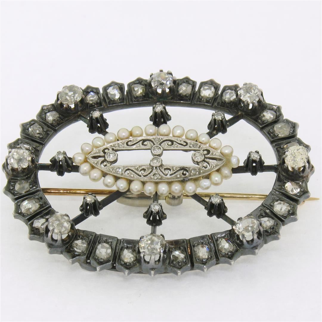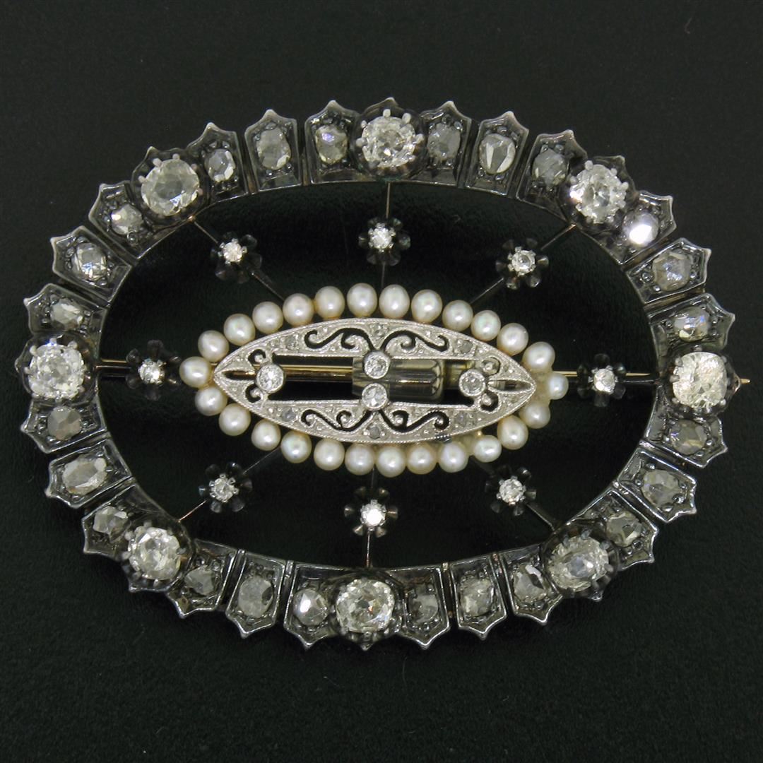 Am antique solid 14k yellow gold and sterling silver pin brooch, featuring 50 rose cut, old mine cut and singke cut natural diamonds (G/I- SI1/SI2; 3.91ctw), with 26 natural pearls (). Measures 37.65x49.20mm and weighs a total of 16.38 grams.