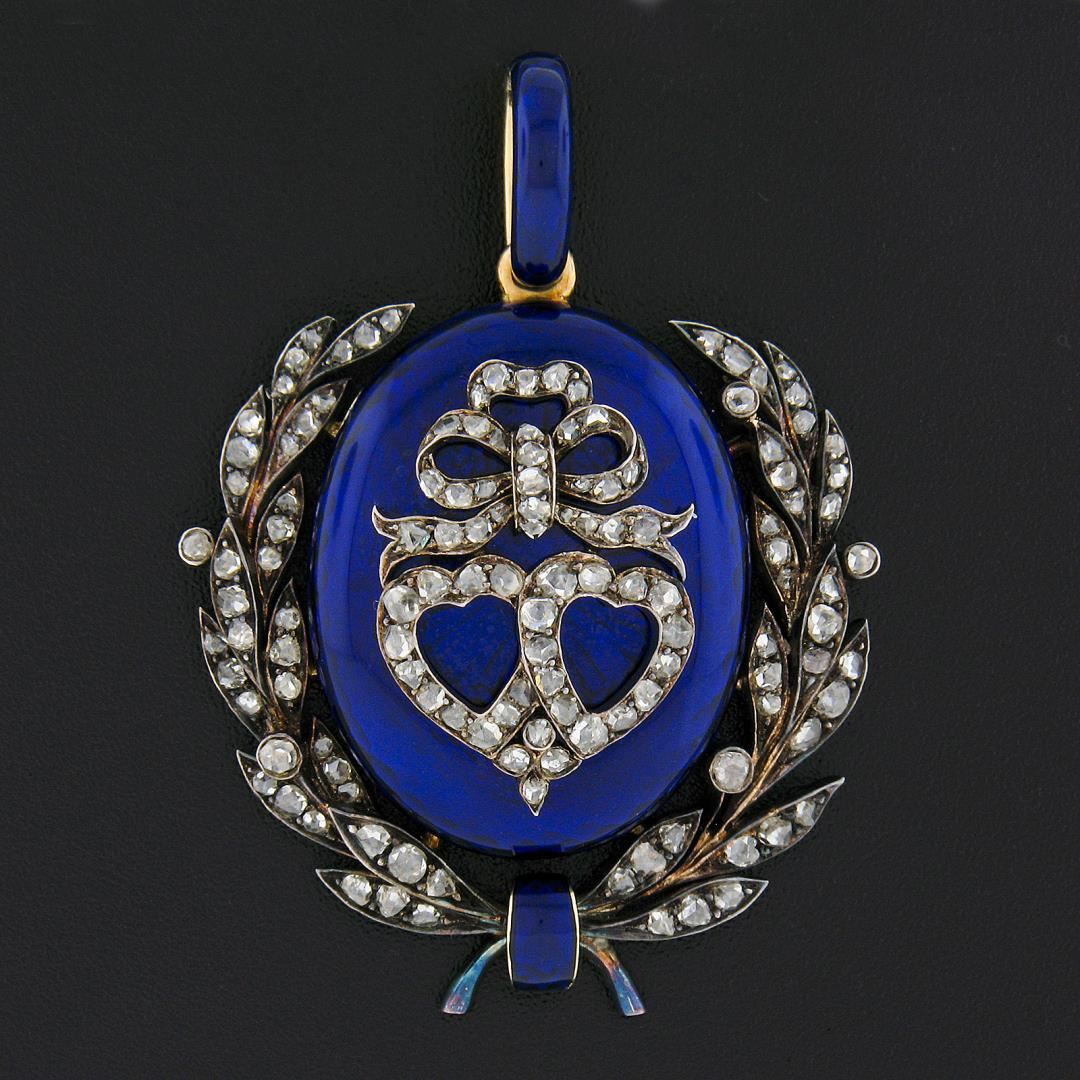 An antique solid 14k yellow gold & silver pendant, with 133 old rose cut natural diamonds (G/J - SI1/SI2 ; 2ctw). The pendant weighs a total of 18.94 grams, measures 52.10x38mm including the bail, and the inside of the bail measures 7.7.x5.9mm.