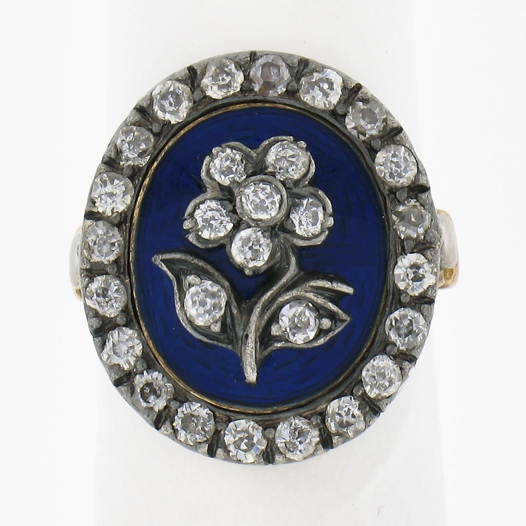 An antique solid 14k yellow gold & Silver flower platter ring, with blue enamel work and 28 old single & mine cut natural diamonds (G-I - VS2-SI2 ; 0.50ctw). The ring is size 2.0, weighs a total of 4.75 grams, and measures 16.9mm wide.