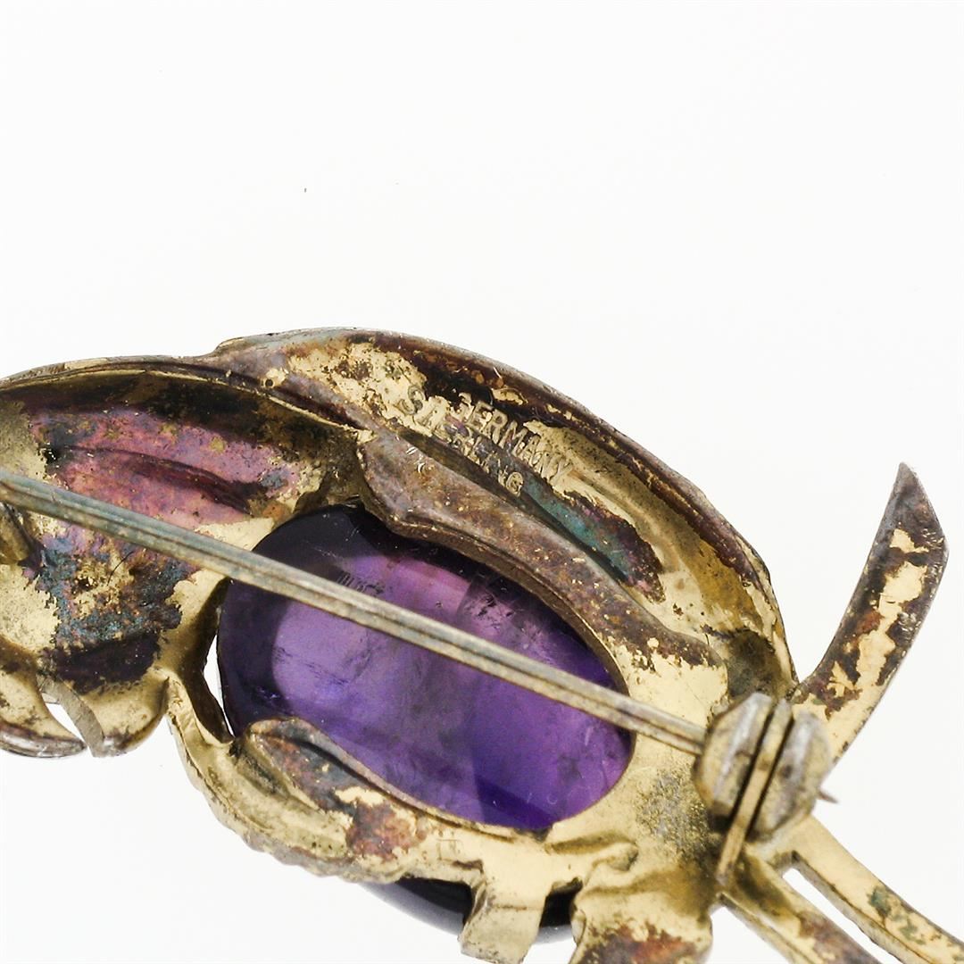 An antique German vermeil silver and yellow gold textured parrot brooch pin with 1 natural amethyst (16.25x12.20mm - 9.08ct) and 1 white cultured pearl (3.65mm). Measures 52.25x33.75mm and weighs a total of 9.13 grams.
