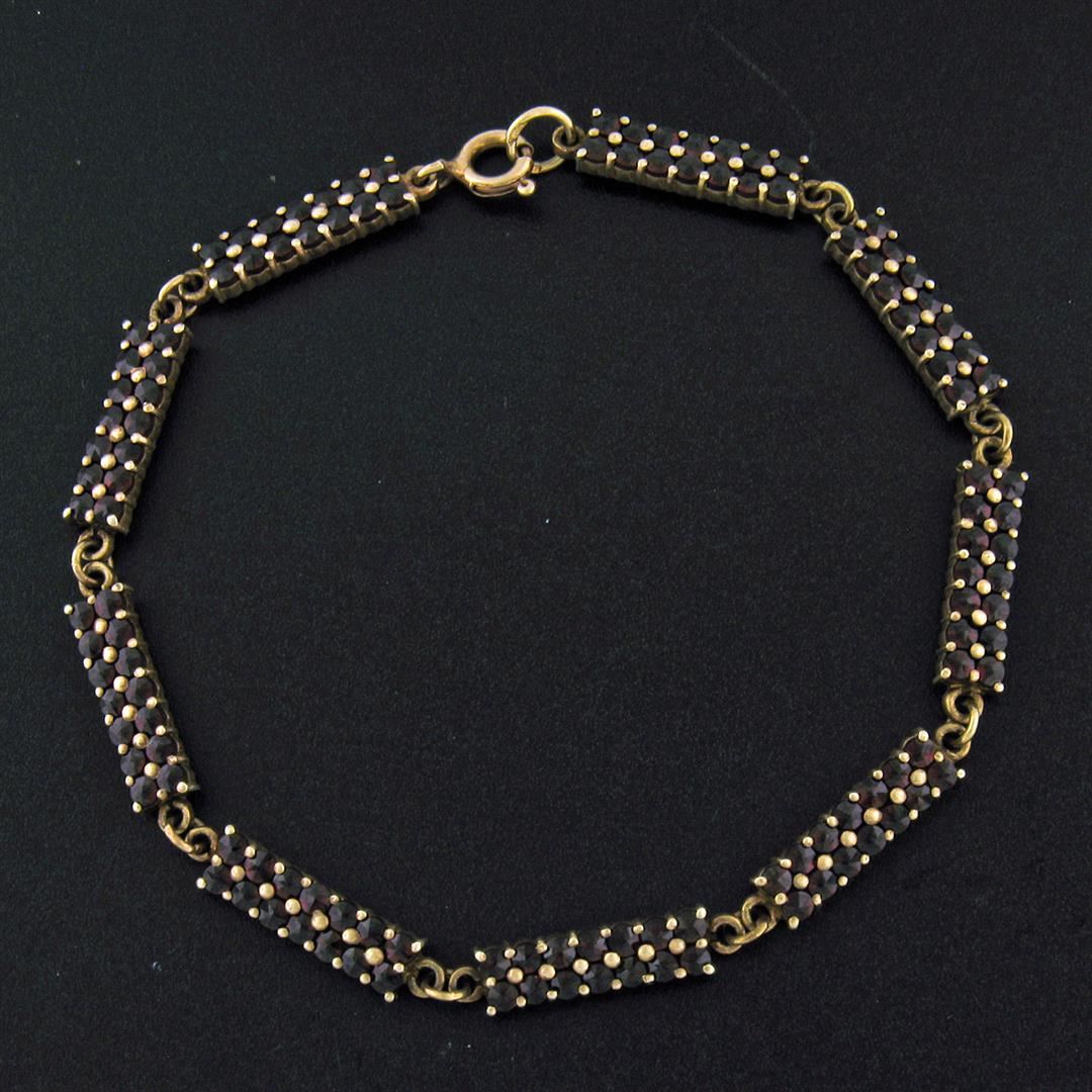 An antique solid Gilded Silver tennis bracelet, featuring 126 old round cut natural bohemian garnets (6.30ctw ). It weighs a total of 10.1 grams, measures 5.0mm wide, and measures 8.0 inches in length.