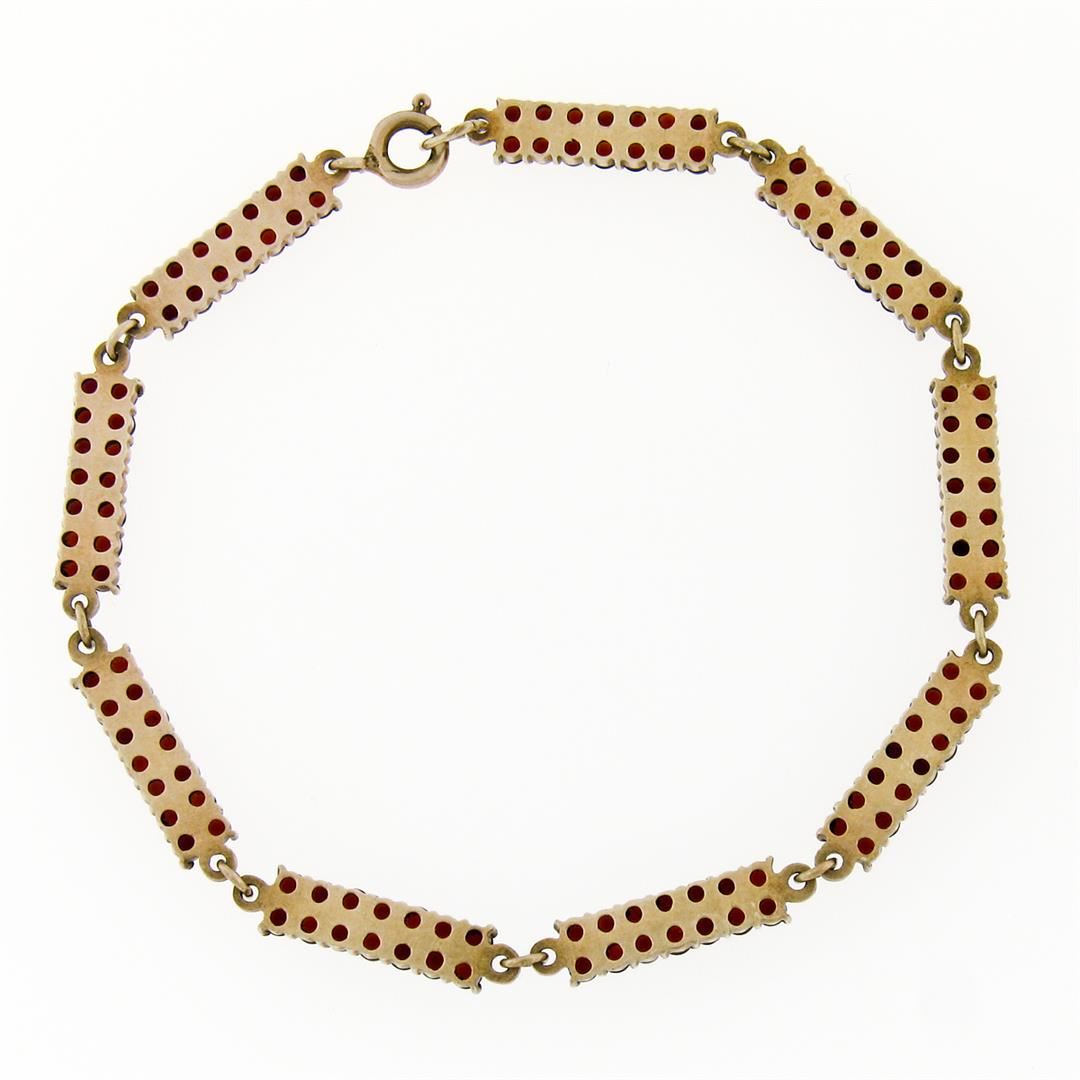 An antique solid Gilded Silver tennis bracelet, featuring 126 old round cut natural bohemian garnets (6.30ctw ). It weighs a total of 10.1 grams, measures 5.0mm wide, and measures 8.0 inches in length.