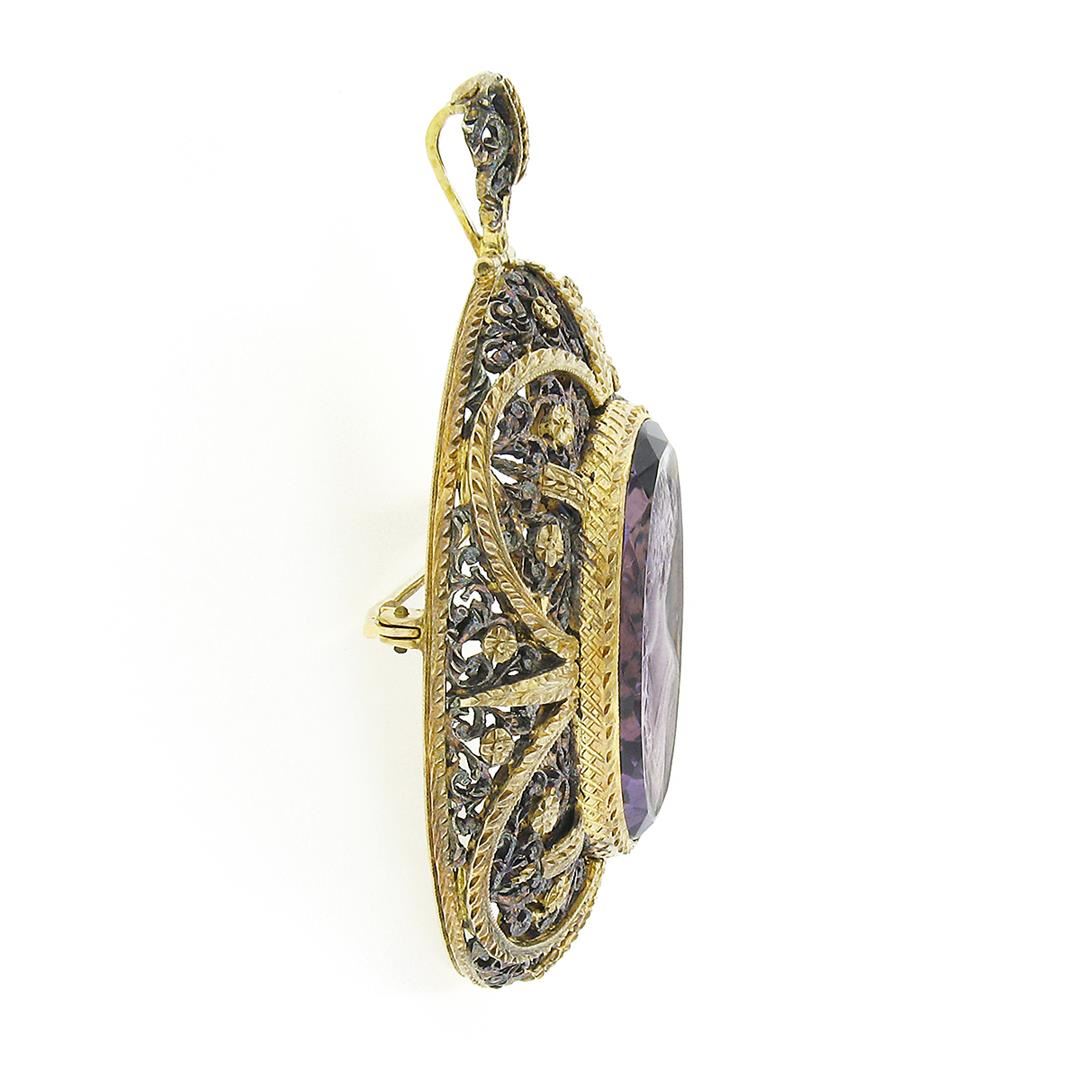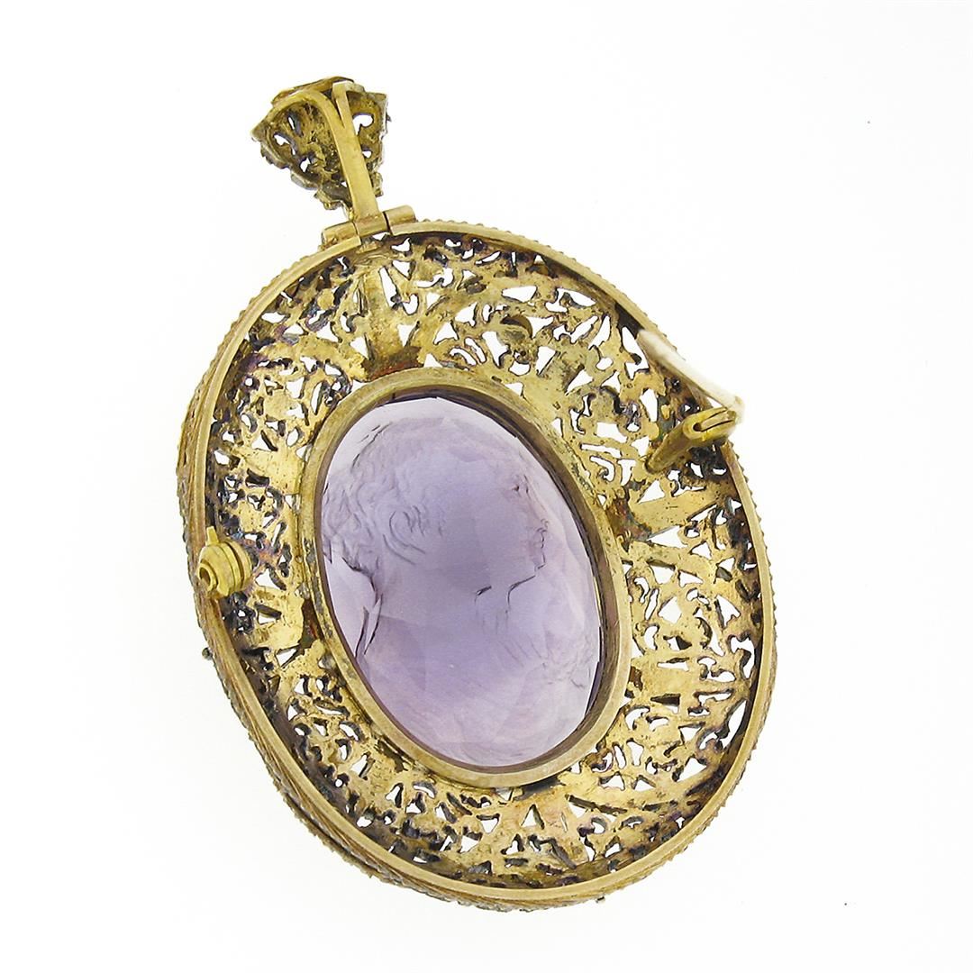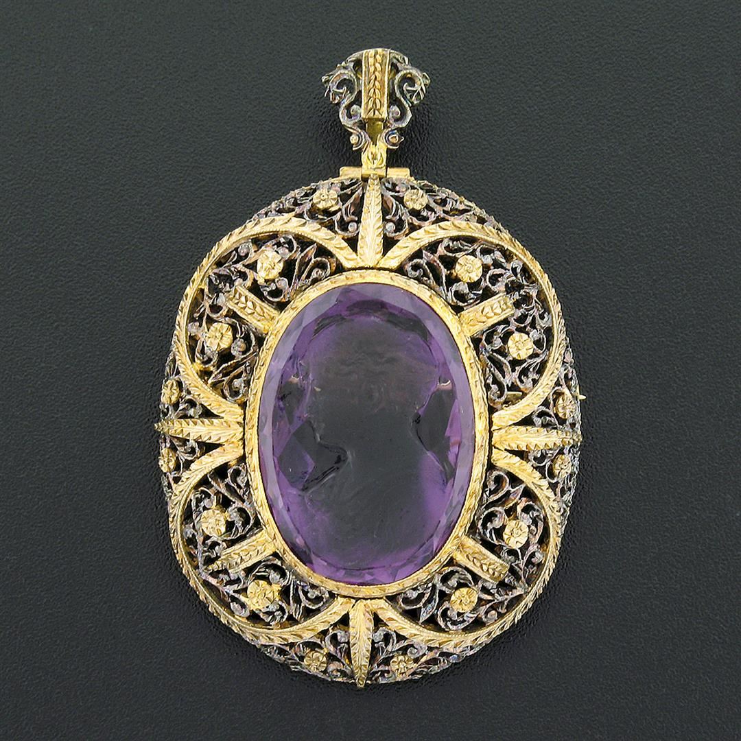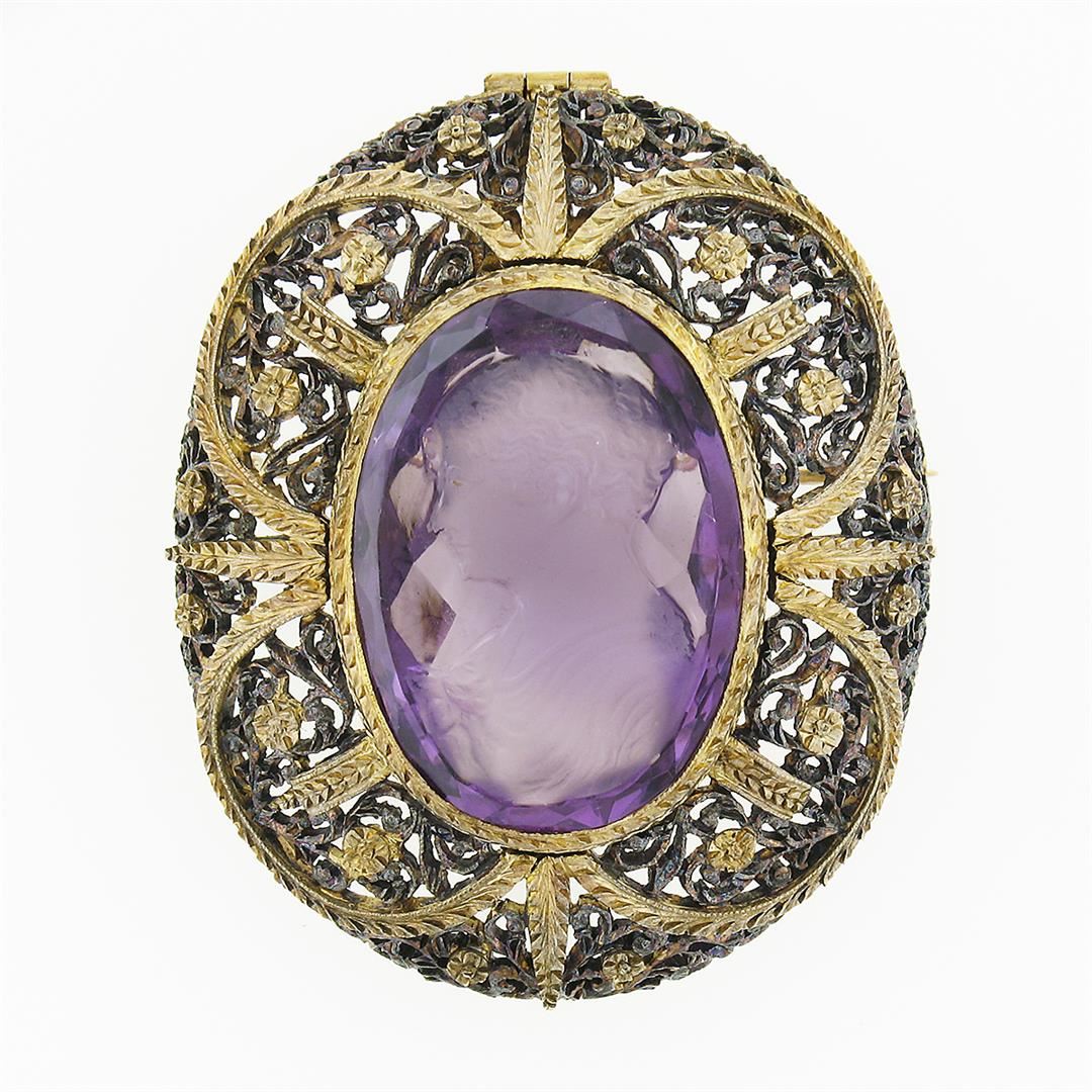 An antique solid 14k yellow gold brooch or pendant by Giovanni Apa, with 1 oval shape hand carved cameo natural amethyst (27.50ct). Measures 47.15x38.75mm and weighs a total of 22.81 grams.