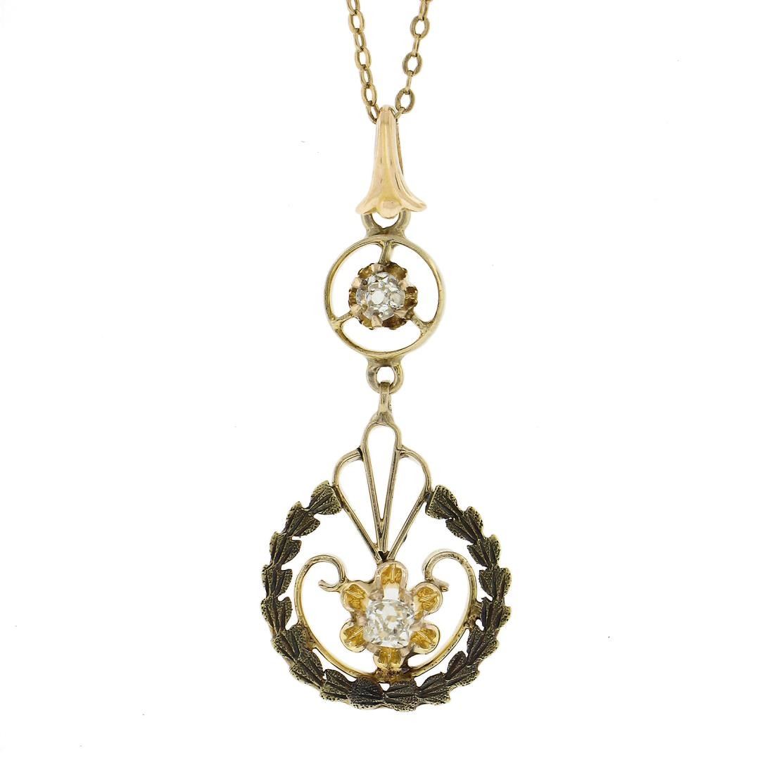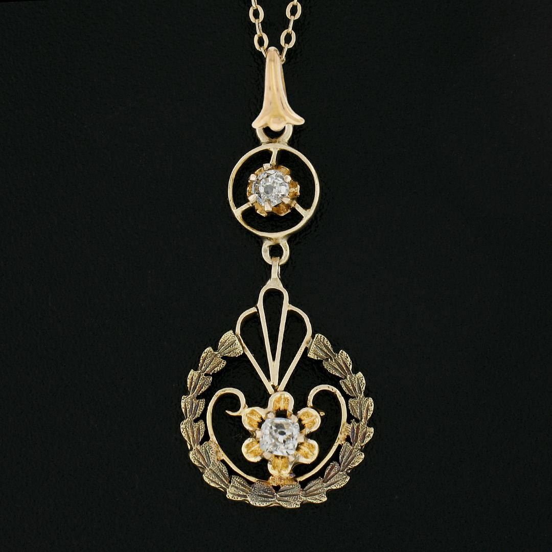 An antique solid 14k yellow gold pendant necklace, with 2 old mine cut natrual diamonds (H/I - VS2/SI1 ; 0.14ctw). 16.5 inch cable link chain, 2.18 grams total weight, pendant measures 29.2x12.7mm.