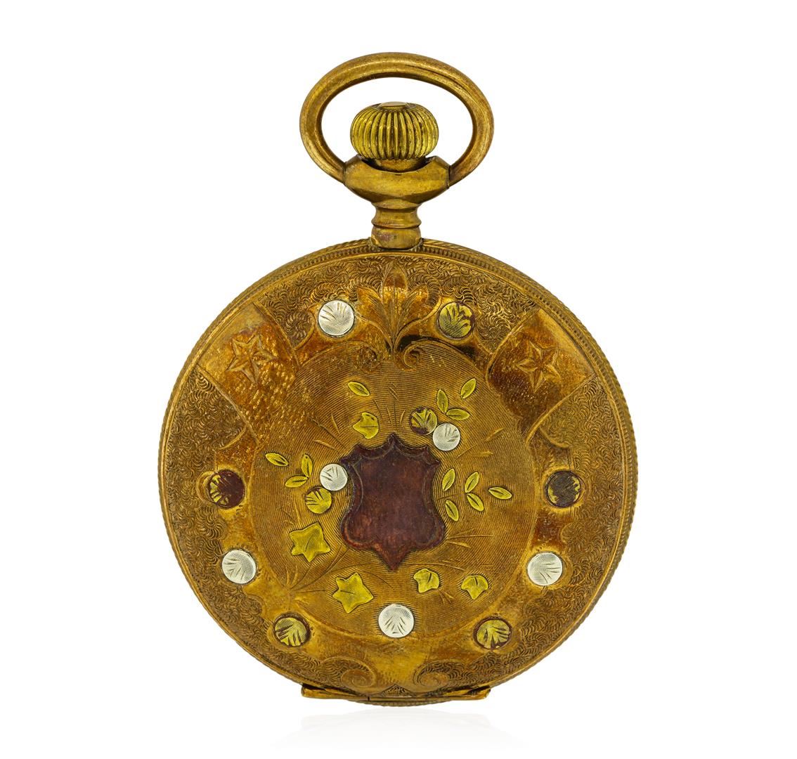 One Hampden Watch Co. antique 14KT Yellow Gold Pocketwatch. Movement: Mechanical with manual winding, serial number 1444854. Case: Hunter, 14KT Yellow Gold engraved on both sides, measures 54mm in diameter, case number 0156659. Case signed "14KP". Dial: White enamel with painted Roman numerals and blued steel hands. Seconds sub-dial is located at 6 o'clock. Condition: G-4 FINE, (good working order and good condition). Total Weight of Watch: 116.40gm.