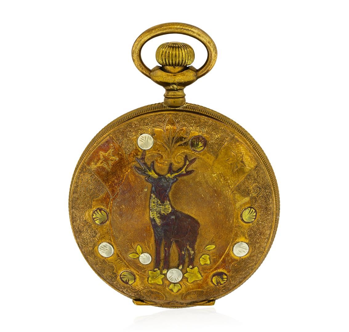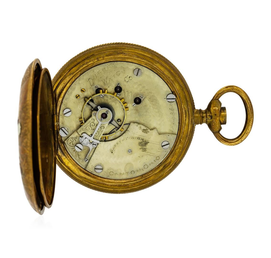 One Hampden Watch Co. antique 14KT Yellow Gold Pocketwatch. Movement: Mechanical with manual winding, serial number 1444854. Case: Hunter, 14KT Yellow Gold engraved on both sides, measures 54mm in diameter, case number 0156659. Case signed "14KP". Dial: White enamel with painted Roman numerals and blued steel hands. Seconds sub-dial is located at 6 o'clock. Condition: G-4 FINE, (good working order and good condition). Total Weight of Watch: 116.40gm.