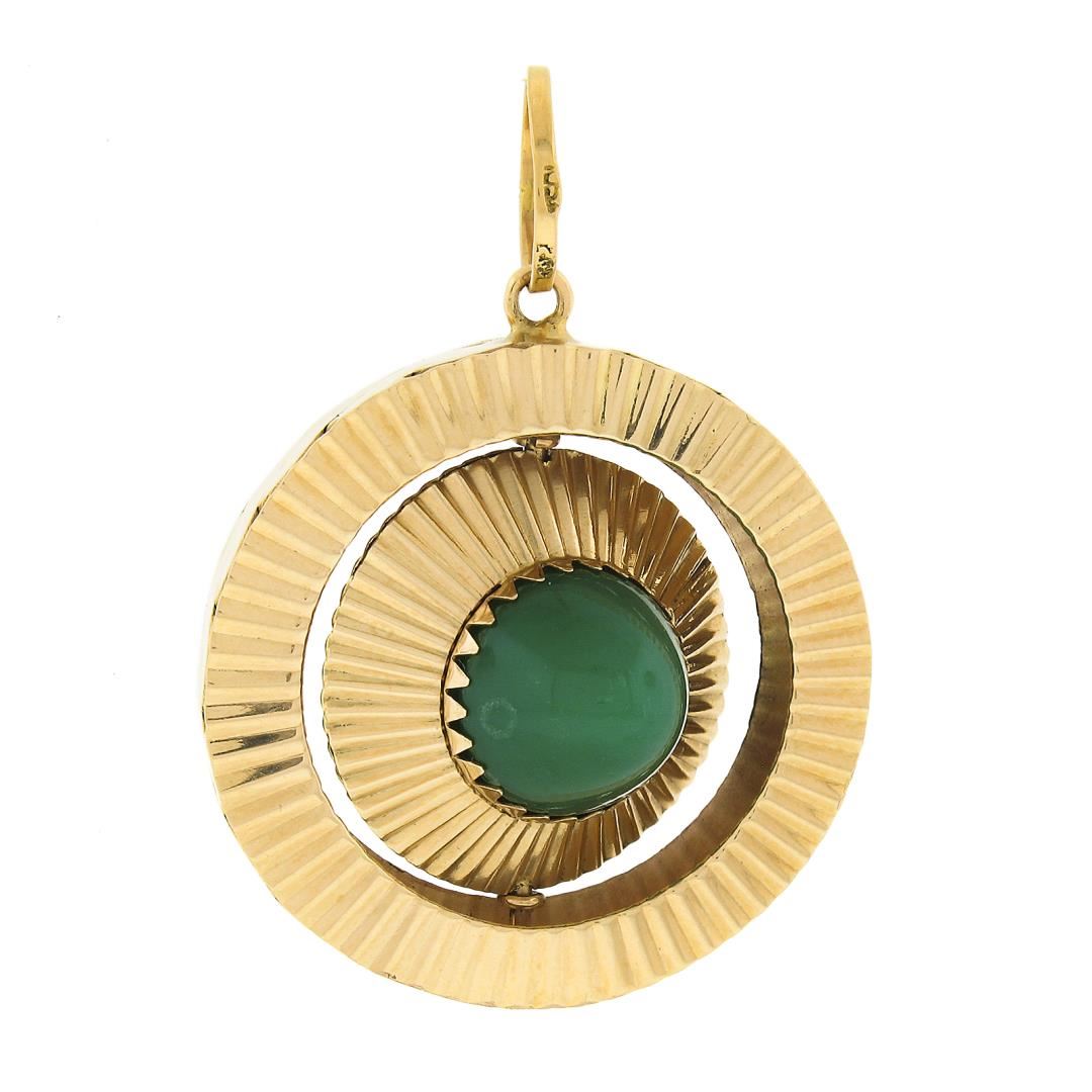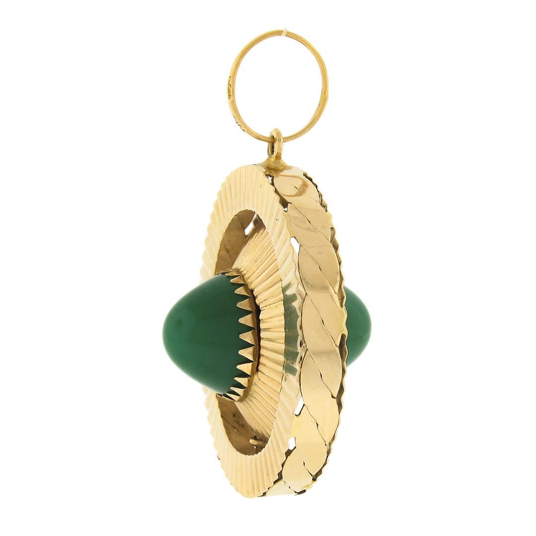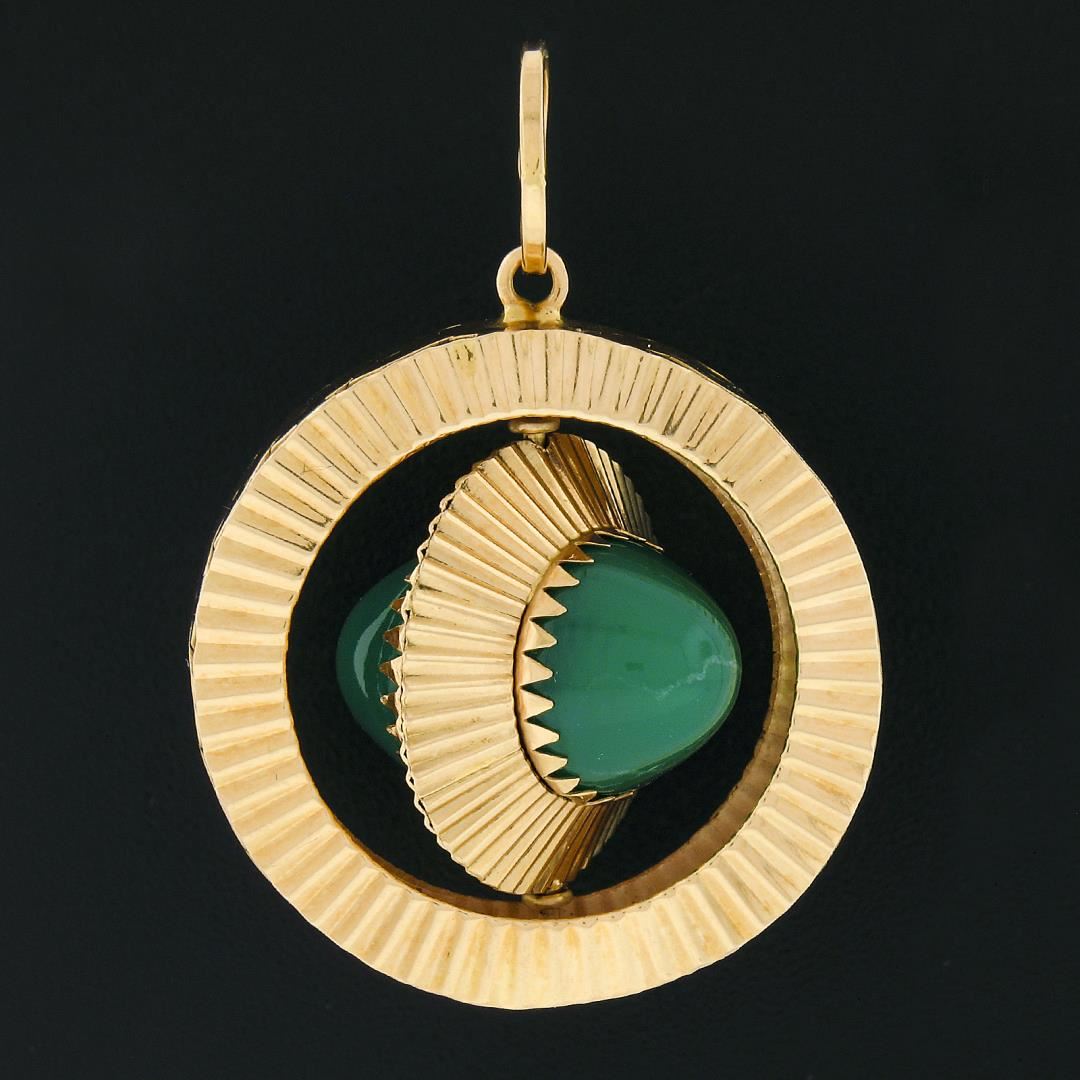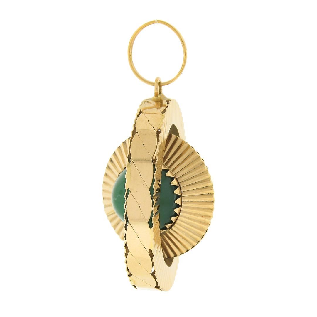 An antique solid 18k yellow gold pendant, with 2 round cabochon cut chrysoberyl or turquoise (12mm each). The pendant weighs a total of 10.93 grams, measures 44.70x32mm including the bail, and the inside of the bail measures 8.8mm.
