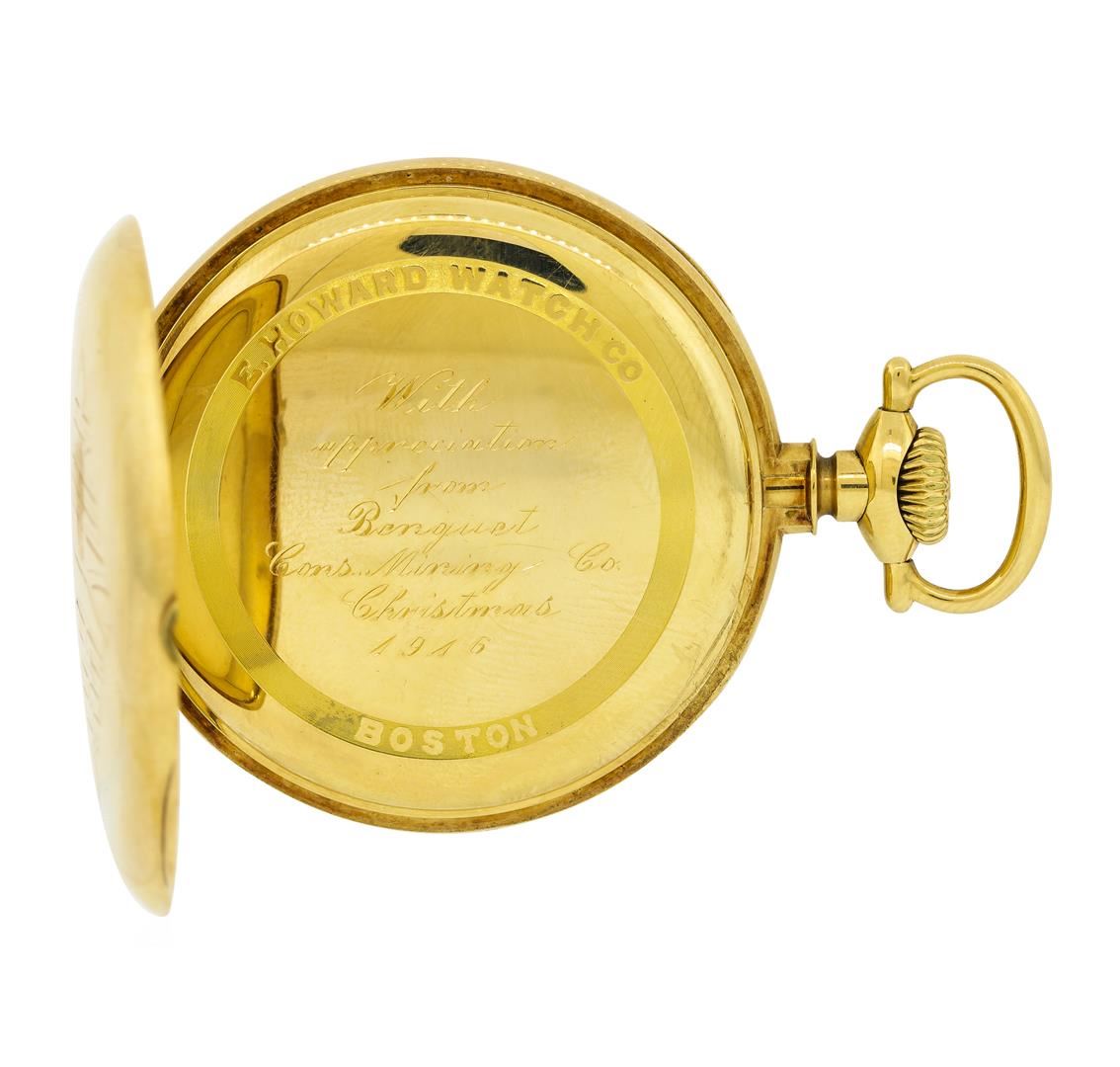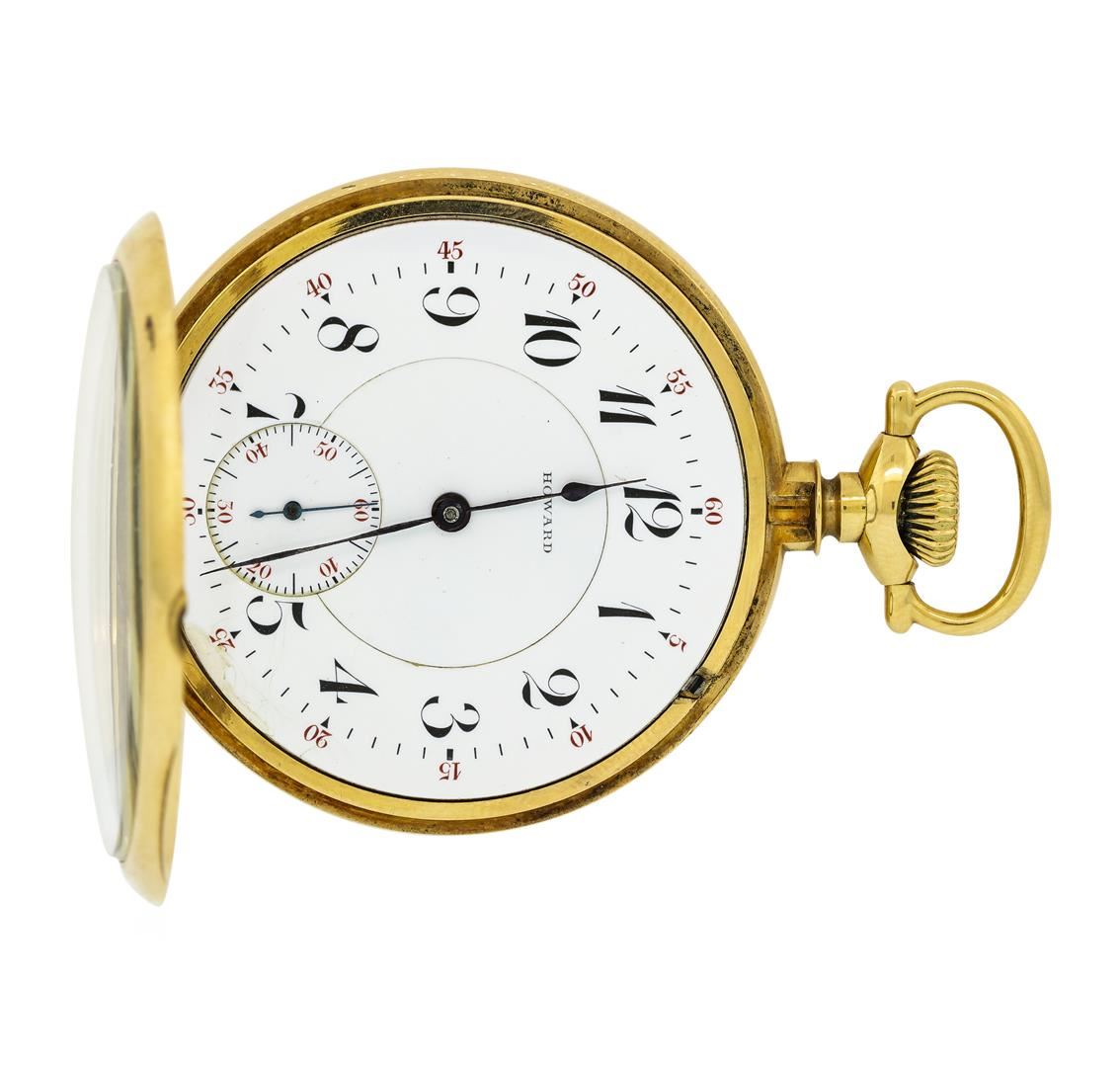 One Howard Watch Co. antique 14KT yellow gold open-face pocketwatch. Movement: Mechanical with manual winding, 23 jewels, serial number 1113359. Case: Open-Face, 14KT Yellow Gold, engraved on the back, measures 48mm in diameter, case number 137019. Case signed "14K". Dial: What enamel with painted Arabic numerals and blued steel hands. Seconds sub-dial is located at 6 o'clock. Condition: G-4 FINE, (good working order and good condition). Total Weight of Watch: 86.90gm.