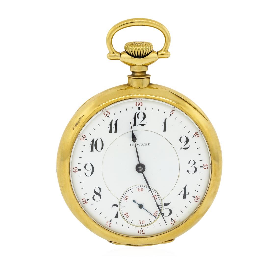One Howard Watch Co. antique 14KT yellow gold open-face pocketwatch. Movement: Mechanical with manual winding, 23 jewels, serial number 1113359. Case: Open-Face, 14KT Yellow Gold, engraved on the back, measures 48mm in diameter, case number 137019. Case signed "14K". Dial: What enamel with painted Arabic numerals and blued steel hands. Seconds sub-dial is located at 6 o'clock. Condition: G-4 FINE, (good working order and good condition). Total Weight of Watch: 86.90gm.