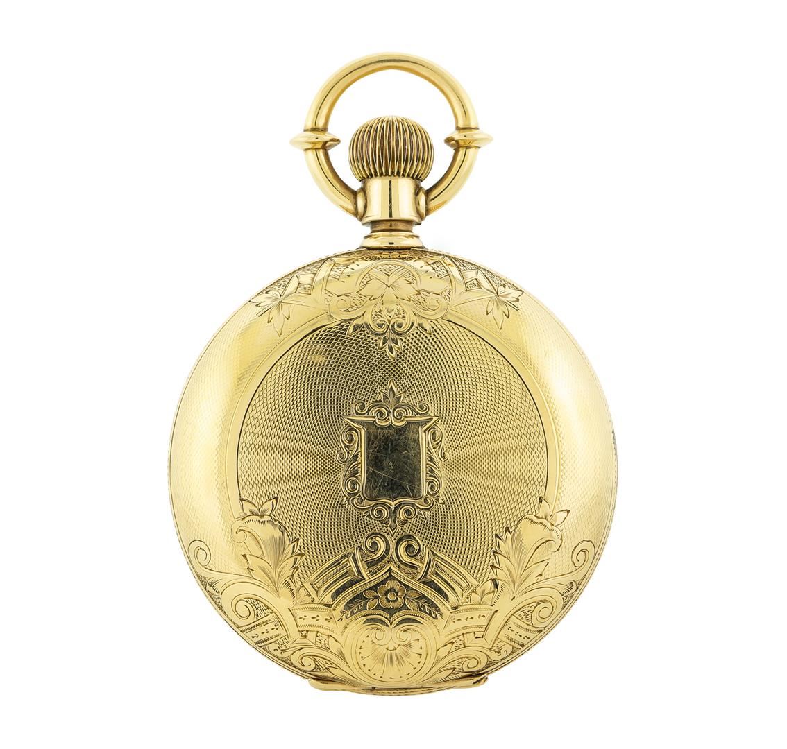 One Illinois Watch Co. antique 18KT Yellow Gold Pocketwatch. Movement: Mechanical with manual winding, serial number 53892. Case: Hunter, 18KT Yellow Gold engraved on both sides, measures 52mm in diameter, case number 19504. Case signed "18". Dial: White enamel with painted Roman numerals and blued steel hands. Seconds sub-dial is located at 6 o'clock. Condition: G-4 FINE, (good working order and good condition). Total Weight of Watch: 120.00gm.