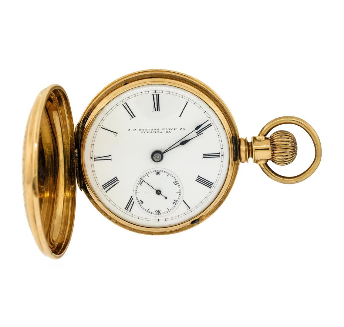 One J.P. Stevens Watch Co antique 14KT Rose Gold Pocketwatch. Movement: Mechanical with manual winding, serial number 154730. Case: Hunter, 14KT Rose Gold, engraved on both sides, measures 51mm in diameter, case number 43876. Case signed "14K". Dial: White enamel with painted Roman numerals and blued steel hands. Seconds sub-dial is located at 6 o'clock. Condition: G-4 GINE, (good working order and good condition). Total Weight of Watch: 128.50gm.