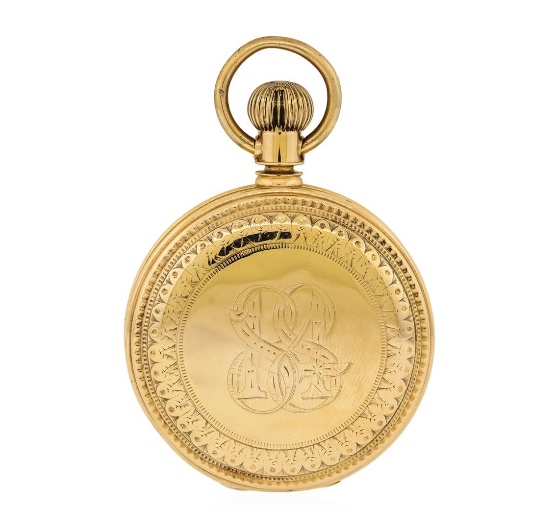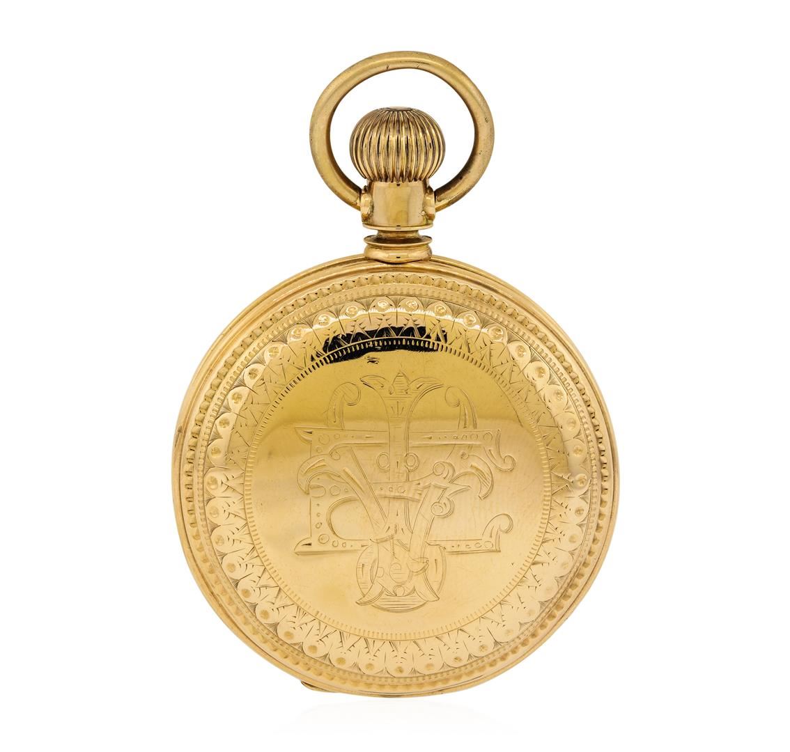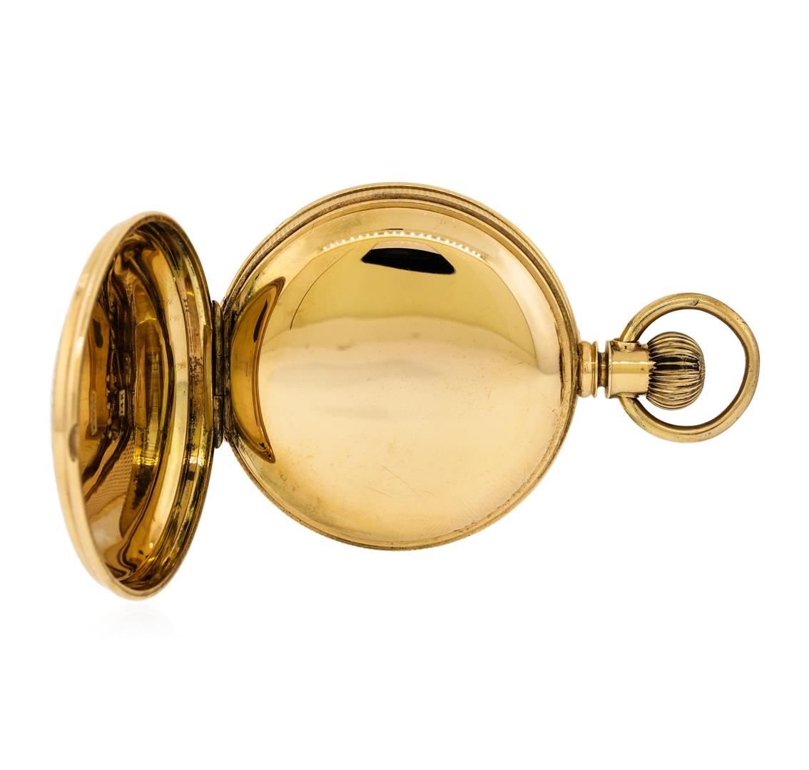 One J.P. Stevens Watch Co antique 14KT Rose Gold Pocketwatch. Movement: Mechanical with manual winding, serial number 154730. Case: Hunter, 14KT Rose Gold, engraved on both sides, measures 51mm in diameter, case number 43876. Case signed "14K". Dial: White enamel with painted Roman numerals and blued steel hands. Seconds sub-dial is located at 6 o'clock. Condition: G-4 GINE, (good working order and good condition). Total Weight of Watch: 128.50gm.