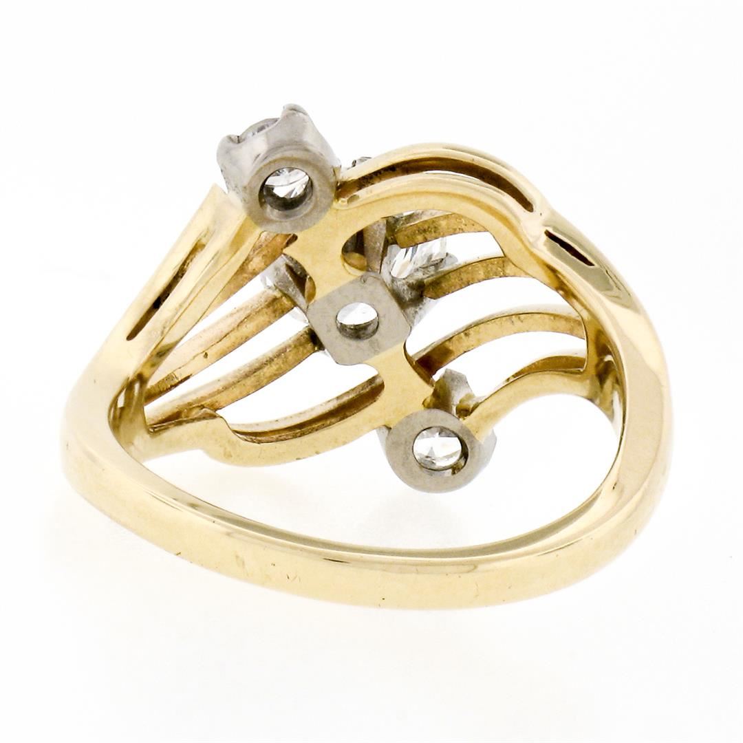 An anitqiue solid 14 yellow gold and white gold open swirl engagement ring. with 1 Gia certified round brilliant cut natural diamonds (G - SI1 ; 1.03ct), and 2 old european cut natural diamonds (G/H - VS1/VS2 ; 0.16ctw). The ring is size 5.5, weighs a total of 4.27 grams, and measures 14.7mm wide. Comes with all original relevant certifications.
