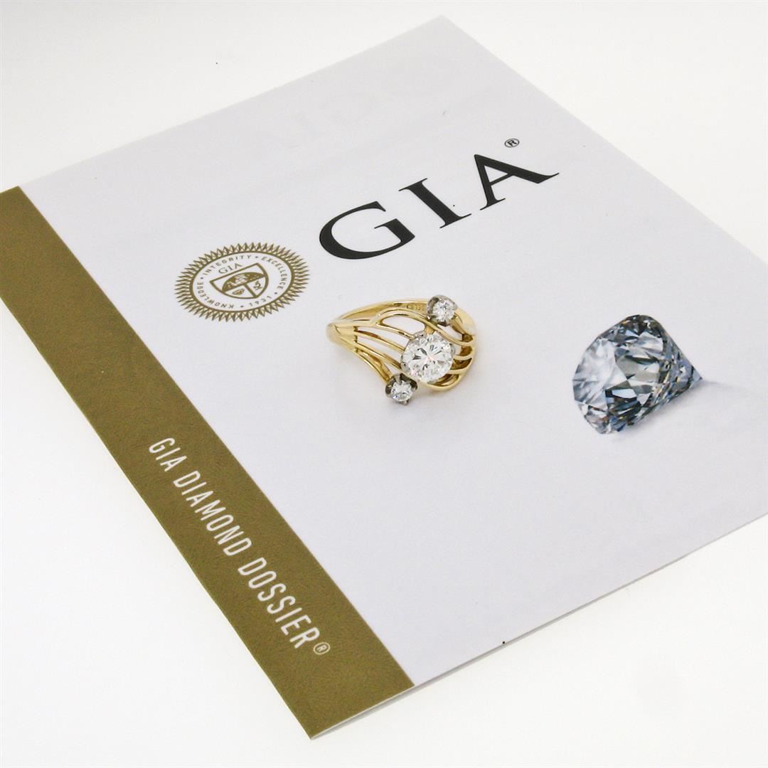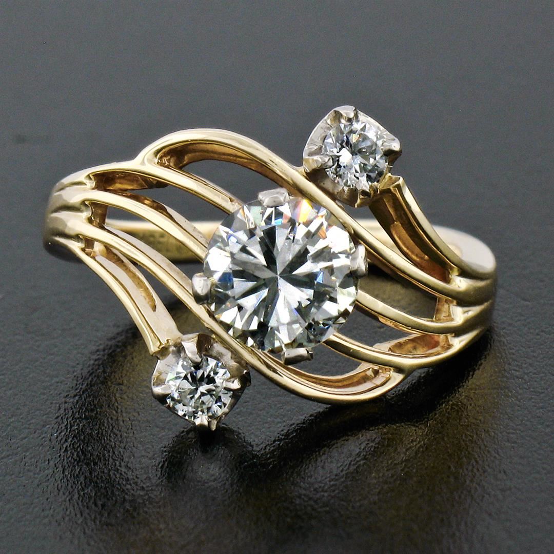 An anitqiue solid 14 yellow gold and white gold open swirl engagement ring. with 1 Gia certified round brilliant cut natural diamonds (G - SI1 ; 1.03ct), and 2 old european cut natural diamonds (G/H - VS1/VS2 ; 0.16ctw). The ring is size 5.5, weighs a total of 4.27 grams, and measures 14.7mm wide. Comes with all original relevant certifications.