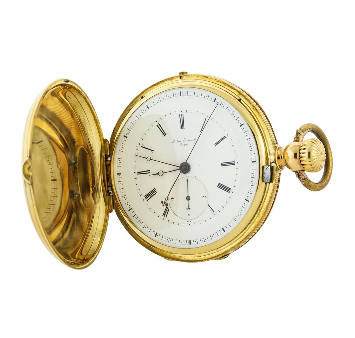 One Jules Emmery Lagne antique 18KT Yellow Gold Pocketwatch N9006. The watch has been tested for gold purity. Movement: Mechanical with manual winding. Case: Hunter, 18KT Yellow Gold, measures 52mm in diameter, case number 4600. Case signed "JAD 21206". Dial: White enamel with painted Roman numerals and blued steel hands. Outer 1/5th seconds scale, subsidiary dial for flying quarter seconds. Condition: G-4 FINE, (good working order and good condition). Total Weight of Watch: 127.70gm.
